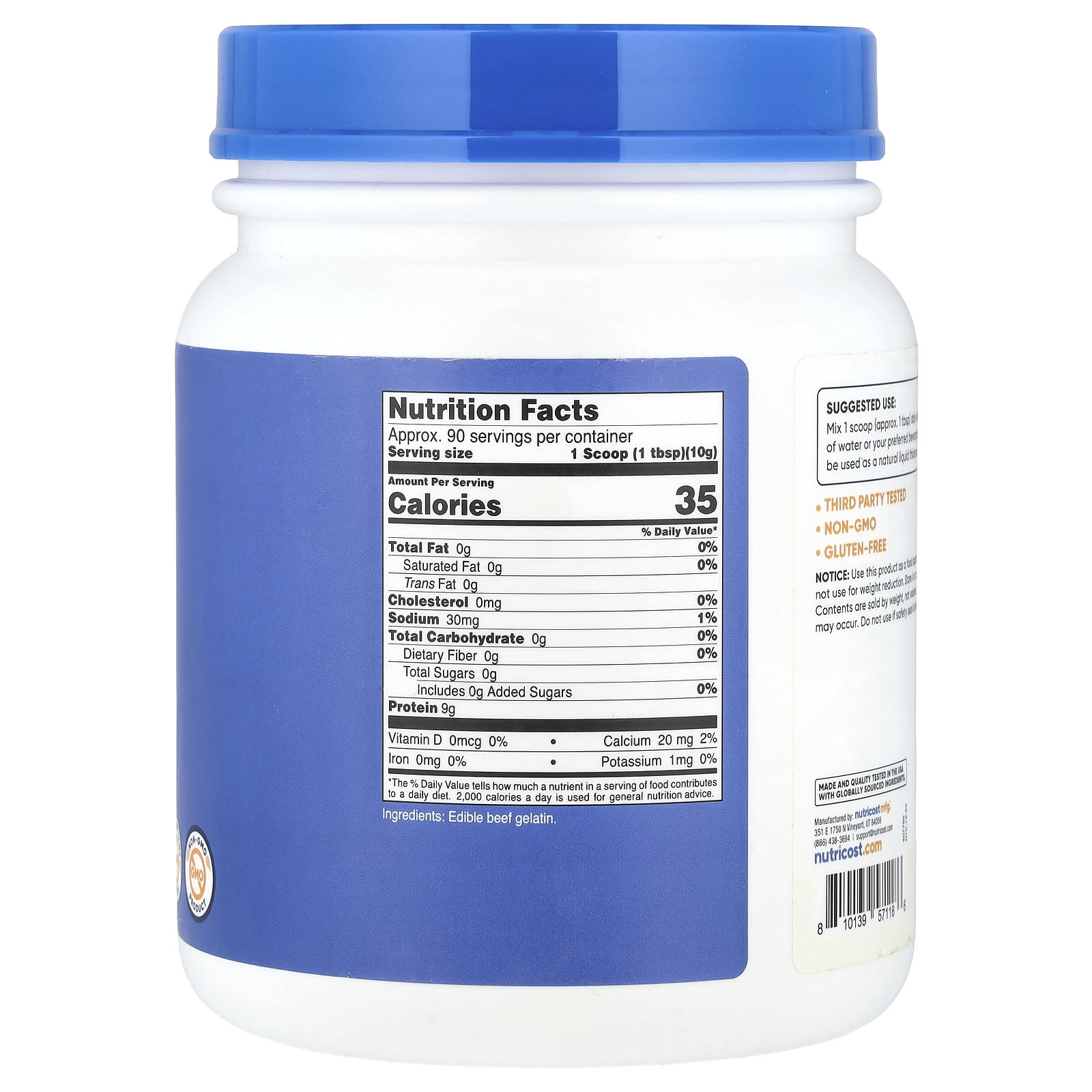 Garantia de Qualidade: Produzido em uma instalação com Certificação GMP pela NSF e submetido a rigorosos testes de terceiros por laboratórios independentes com certificação ISO, o compromisso da Nutricost com a qualidade garante que você receba um produto premium que se alinha com suas escolhas saudáveis. Abrace a excelência da gelatina pura de carne bovina e valorize seu bem-estar.