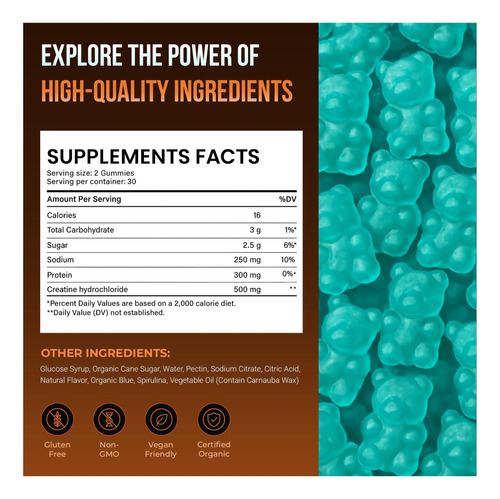 Força e resistência muscular: cada goma oferece creatina monohidratada pura para ajudar a aumentar a força, resistência e desempenho muscular durante exercícios ou treinamento atlético. Recuperação mais rápida,