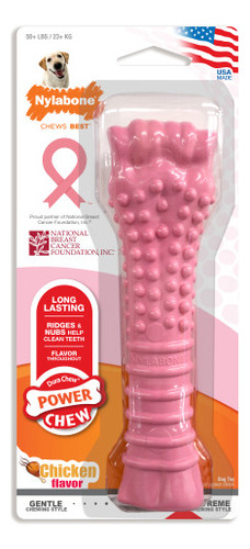 Nosso brinquedo Power Chew rosa oferece uma maneira de você e seu familiar peludo mostrarem apoio à conscientização sobre o câncer de mama. Para cada um desses brinquedos personalizados para mastigar Nylabone Souper que você comprar, doaremos $1 para a National Breast Cancer Foundation, Inc. Essa honrosa organização inspira esperança às pessoas afetadas pelo câncer de mama por meio de serviços de detecção precoce, educação e apoio. Além de ajudar a aumentar a conscientização sobre essa causa honrosa, nosso brinquedo duradouro para mastigar para cães ajudará seu amigo peludo a aprender hábitos de mastigação saudáveis e não destrutivos. Este brinquedo de náilon para mastigar resiste aos mastigadores poderosos e oferece entretenimento contínuo para satisfazer seu desejo natural de mastigar. Apresenta um sabor saboroso de frango por toda parte e uma superfície texturizada única, oferecendo ao seu cão ainda mais diversão de mastigar! Além disso, este brinquedo para mastigar ossos inclui protuberâncias e sulcos que promovem a limpeza dos dentes e ajudam a controlar a placa bacteriana e o tártaro enquanto seu cão mastiga. Nosso brinquedo extra grande para roer para cães é recomendado para cães com mais de 50 libras e é orgulhosamente feito nos Brasil! Feito de nylon durável O brinquedo duradouro para mastigar para cães desafia até mesmo os mastigadores mais agressivos e desencoraja a mastigação destrutiva. Para cada brinquedo rosa personalizado comprado, a Nylabone doará 1 dólar para a National Breast Cancer Foundation, Inc. O brinquedo texturizado para mastigar inclui protuberâncias e sulcos que ajudam a limpar os dentes e controlar a placa bacteriana e o tártaro enquanto seu cão mastiga. Feito nos Brasil O brinquedo para roer para cães é orgulhosamente fabricado no Brasil. Brinquedo de mastigar XL para cães com mais de 50 libras. Apresenta um delicioso sabor de frango por toda parte. Dimensões do brinquedo para mastigar: a embalagem mede 7,75 de comprimento x 2,25 de largura x 1 de altura.