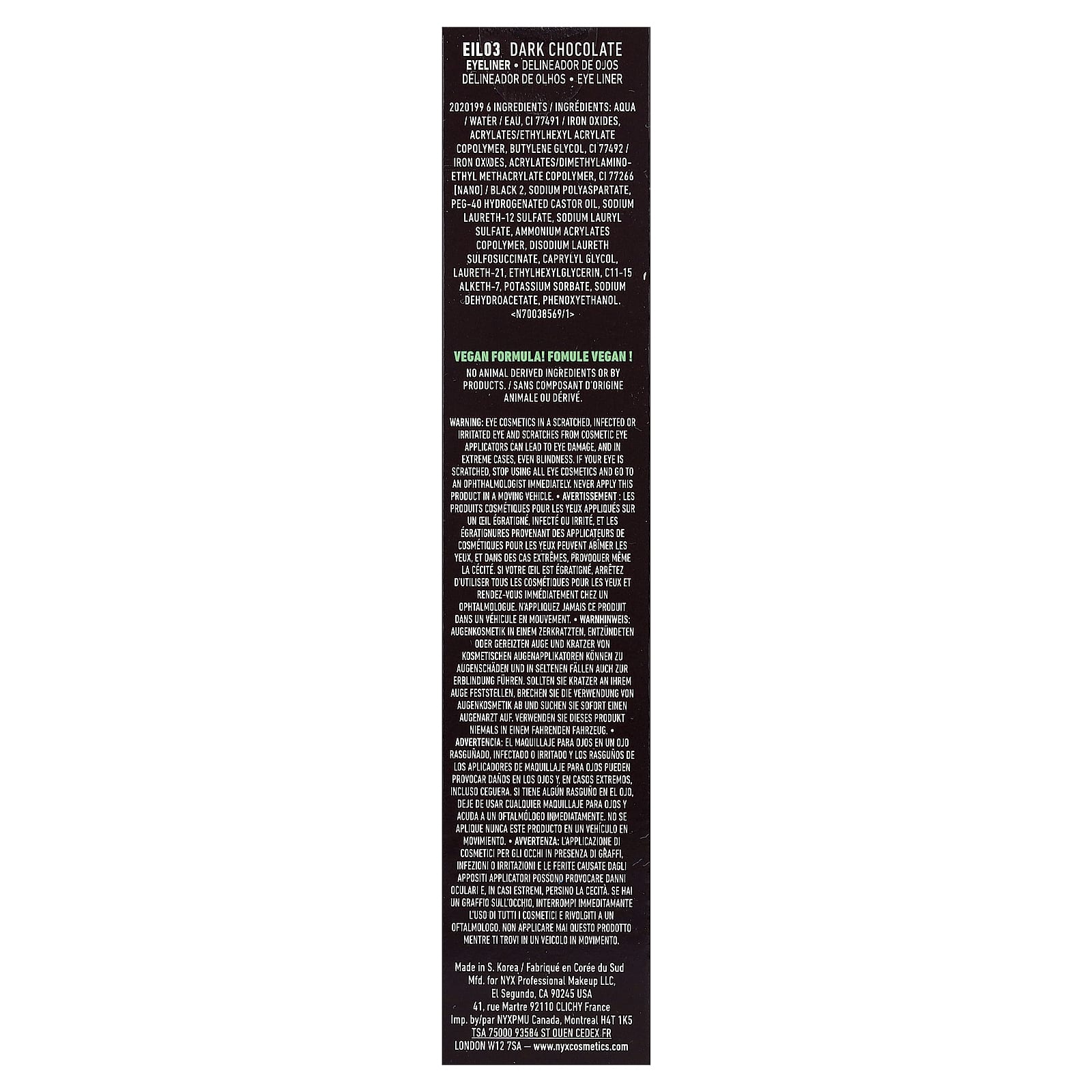 Água, CI 77491/óxidos de ferro, acrylates/ethylhexyl acrylate copolymer, butilenoglicol, CI 77492/óxidos de ferro, copolímero de acrilatos/dimetilaminoetil metacrilato, CI 77266 [nano]/preto 2, poliaspartato de sódio, óleo de rícino hidrogenado peg-40, sodium laureth-12 sulfate, laurilsulfato de sódio, copolímero de acrilatos de amônio, disodium laureth sulfosuccinate, caprylyl glycol, laureth-21, ethylhexylglycerin, c11-15 alketh-7, sorbato de potássio, sodium dehydroacetate, fenoxietanol.
