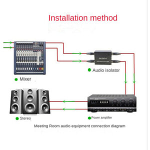 Elimine o ruído gerado pela conexão entre a câmera e o equipamento de áudio; o ruído gerado quando o equipamento de interpretação simultânea é conectado ao console de mixagem; o ruído gerado pelo laptop conectado ao console de mixagem; o ruído gerado pelo instrumento musical eletrônico conectado ao console de mixagem. Ele