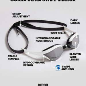 Óculos de natação unissex Arena Cobra Ultra Swipe Racing para homens e mulheres com tecnologia antiembaçante Swipe, prateada/rosa — acabamento sem embaçamento e em ouro com a proteção antiembaçante mais avançada de todos os tempos; a tecnologia antiembaçante Swipe prolonga a vida útil de seus óculos restaurando a proteção antiembaçante em perfeitas condições — Quando os óculos ficarem embaçados, ative o revolucionário antiembaçante Swipe película protetora passando suavemente as lentes internas cinco vezes com a ponta do dedo enquanto os óculos estão na água – Criado para natação competitiva com um design superhidrodinâmico altamente avançado com formato de lente especial para ampla visibilidade subaquática, deslizamento ideal e menos arrasto em alta velocidade – As hastes laterais longas e moldadas oferecem uma estabilidade incrível, especialmente ao mergulhar, enquanto as confortáveis vedações de silicone macio mantêm seus óculos no lugar e evitam a entrada de água – Ideal para natação interna e ambientes com pouca luz, com construção de lentes de policarbonato para maior durabilidade e cinco pontes nasais intercambiáveis para personalização perfeita