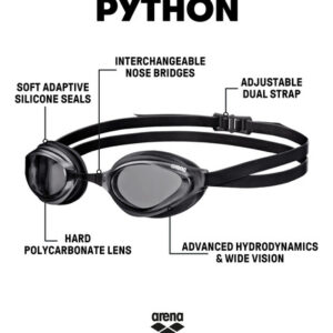 Abra seus olhos para a arena Unissex Adult Racing Swim Goggles Python, projetados para máximo conforto e hidrodinâmica avançada. Ideal para nadadores competitivos, esses óculos de desempenho apresentam lentes curvas que garantem uma excelente visão panorâmica. A alça dupla é facilmente ajustável na parte traseira e garante um ajuste estável, mesmo durante a partida e a rotação. Esses óculos de natação Python são equipados com revestimento antiembaçante, proteção UV e não contêm PVC. Estão incluídos três tamanhos de pontes nasais intercambiáveis para uma personalização perfeita para diferentes formatos de rosto e nariz.
