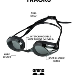 Óculos de natação unissex para adultos essenciais para nadadores competitivos Lente antiembaçante revestida antiembaçante aprovada pela FINA, preta/fumaça/preta – Óculos genius essenciais para homens e mulheres a um preço vantajoso, nosso design Tracks é o seu equipamento ocular preferido para natação competitiva ao ar livre e em piscinas – aprovado pela FINA, projetados para nadadores competitivos com uma estrutura minimalista para excelente hidrodinâmica; como todos os nossos óculos de natação, eles são tratados como antiembaçantes para que você possa dar o melhor de si. Nós os projetamos para se moldarem perfeitamente ao seu rosto para um ajuste estanque e desempenho poderoso, com lentes rígidas sem embaçamento que garantem desempenho duradouro e natação rápida – Com selos de silicone macio e uma alça dupla, são confortáveis de usar, mesmo nas condições mais extremas; inclui 4 pontes nasais intercambiáveis para um ajuste perfeito durante o treinamento ou corrida – De corridas de elite a treinos e fitness diários, os óculos de natação Arena Tracks oferecem desempenho ideal e valor incomparável; sem PVC
