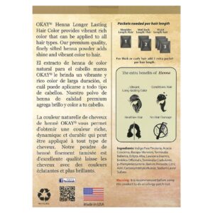 A Coloração Capilar Henna Longer Lasting OKAY® fornece uma cor vibrante e rica que pode ser aplicada em todos os tipos de cabelo. Nosso pó de henna finamente peneirado de qualidade premium adiciona brilho e cor vibrante aos cabelos.