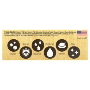 Sodium palmate, sodium palm kernelate, água deionizada, glicerina, sodium cocoyl isethionate, sodium cocoyl glutamate, álcool cetoestearílico, behentrimonium methosulfate, óleo de Cocos nucifera (coco), óleo da fruta de Olea europaea (azeitona), acetato de tocoferol, cloreto de sódio, ácido cítrico, fragrância.