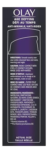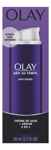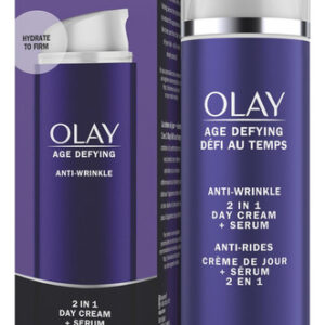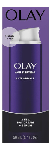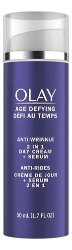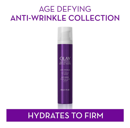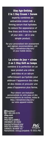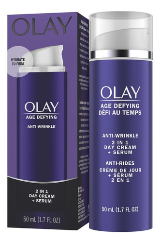 dia 2 em 1 Olay Age Defying + O sérum combina habilmente um creme antirrugas com um sérum firmador que hidrata profundamente para reduzir a aparência de linhas finas e rugas enquanto melhora a pele firmeza. Este produto tudo-em-um fornece hidratação durante todo o dia, deixando a pele macia e sedosa, com aparência mais firme e com um efeito lifting visível.