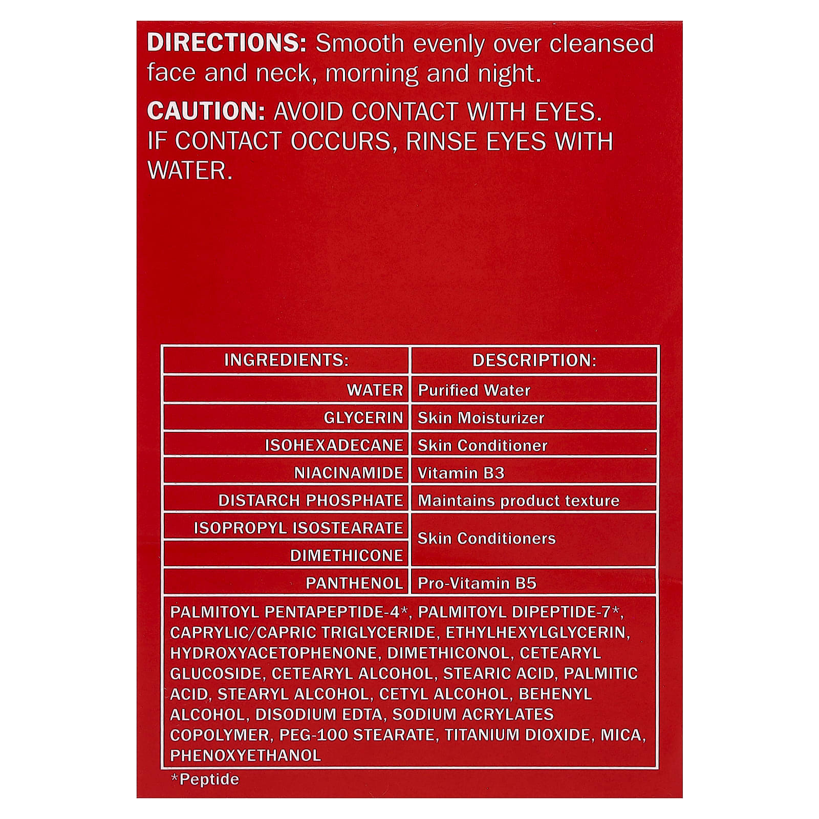 Água, Glicerina, isohexadecano, Niacinamida, fosfato de amido, isoestearato de isopropila, dimeticona, pantenol, palmitoyl pentapeptide-4 *, palmitoyl dipeptídeo-7*, triglicerídeo caprílico/cáprico, etilhexilglicerina, hidroxiacetofenona, Dimeticonol, glicopiranosídeo cetoestearílico, álcool cetearílico, ácido esteárico, ácido palmítico, álcool estearílico, álcool cetílico, behenyl alcohol, EDTA dissódico, copolímero de acrilatos de sódio, estearato de PEG-100, dióxido de titânio, mica, fenoxietanol.