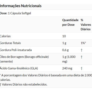 6 g grasa poli-insaturada, 1 g aceite de borraja, 1 g grasa total, 10 kcal valor energetico, 240 mg ácido gamma linolénico