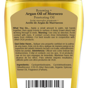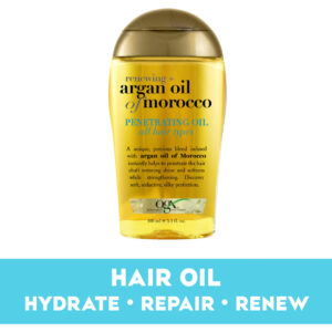 OGX Renewing + Argan Oil of Morocco Penetrating Hair Oil Treatment, Moisturizing & Strengthening Silky Oil for All Hair Types, Paraben-Free, Sulfated-Surfactants Free, 3.3 fl oz – Renew hair with this argan oil of morocco penetrating hair oil treatment Ideal for all hair types, the hair oil helps seal in nutrients and shine to locks, leaving hair strong and silky smooth – RENEWING HAIR OIL: The 3.3-ounce container of OGX Renewing + Argan Oil of Morocco Penetrating Hair Oil Treatment gives hair a renewed look and feel of silky perfection and radiant shine – HAIR CARE FOR ALL TYPES and TEXTURES: Ideal for all hair types, textures and moisture levels, this rich hair oil helps to penetrate the hair shaft while renewing and softening locks – HAIR CARE INSPIRED BY NATURE: This precious blend with rich cold-pressed Moroccan argan oil helps moisturize and revive strands, giving hair a natural boost Plus, the citrus-fresh, floral-green and woody scent leaves hair smelling irresistibly good – NON-HARSH and NOURISHING: Free from parabens, the sulfate-free surfactant haircare system is gentle for use on all hair types and textures to help improve strength and elasticity while creating soft, touchable tresses