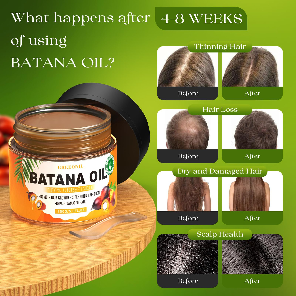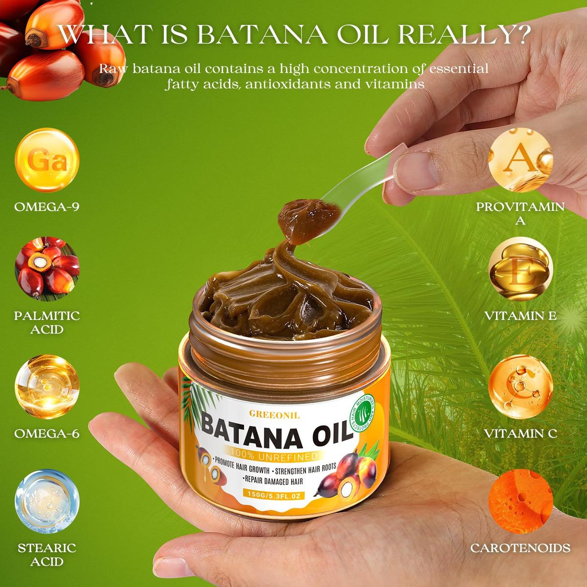 Óleo de batana GREEONIL para o crescimento do cabelo – Óleo de batana cru 100% não refinado para aumentar a espessura do cabelo, prevenir a perda e restaurar cabelos danificados para homens e mulheres, Dr. Sebi Organic, Honduras – Derivado de ingredientes naturais e orgânicos: nosso óleo de batana (óleo de semente de Elaeis Oleifera) é feito de palmeira americana de Honduras por meio de um processo prensado a frio, que permite a máxima retenção de ingredientes orgânicos e naturais – Diga bem adeus à queda de cabelo, calvície e danos: o óleo de Batana orgânico 100% não refinado contém uma variedade de nutrientes, ácido oleico (ômega-9), ácido linoléico ( ômega-6), vitaminas A, C, E, para ajudá-lo a resolver problemas de cabelo e couro cabeludo, promovendo assim o crescimento natural e saudável dos cabelos – Cabelos cada vez mais grossos: o óleo de cabelo Batana é capaz de estimular os folículos capilares, tornando os cabelos mais grossos e elásticos, fortalecendo as raízes do cabelo e ajudando-os a crescer de forma saudável. Nosso óleo de Batana puro é adequado para todos os tipos de cabelo, especialmente crespos, danificados e pontas duplas, e é recomendado pelo Dr. Sebi para todos – Cabelos fáceis de obter macios e sem emaranhados: basta aplicar a quantidade certa de óleo de Batana antes de lavar o cabelo diariamente, ele é rapidamente absorvido. Para obter melhores resultados, é recomendável deixá-lo por 20 minutos, depois enxaguar e usar 3-4 vezes por semana. Seu cabelo fica macio e liso – Excelente qualidade: em Honduras, os habitantes locais usam o óleo dessa palmeira há séculos por causa de suas várias propriedades de saúde e beleza, daí o nome: Óleo milagroso. Se você tiver alguma dúvida durante o uso, entre em contato conosco, estamos sempre à sua disposição