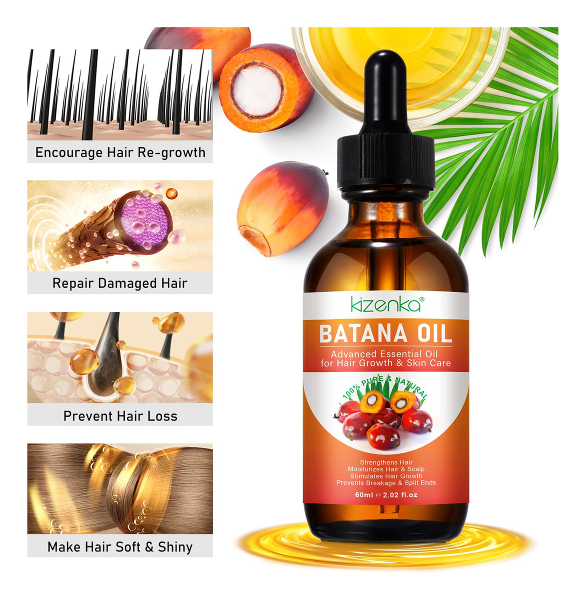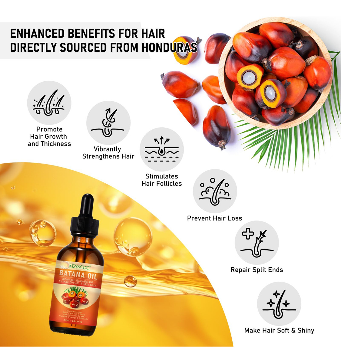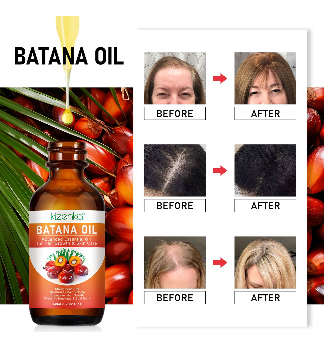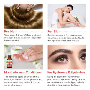 Uso para cabelos: massageie diretamente no couro cabeludo Após um banho ou ducha, tome cerca de 5 gotas de óleo essencial de Batana e massageie uniformemente no couro cabeludo. Misture com um óleo transportador, como óleo de jojoba ou coco. Opcionalmente, você pode enxaguar o óleo depois, mas se o fizer, deixe o óleo repousar no couro cabeludo por pelo menos 5 a 10 minutos primeiro. Mistura com condicionador Isso também se aplica a condicionadores, loções ou cremes. Mas não adicione muito – apenas cinco gotas por onça de produto. Depois, use o produto normalmente. Você também pode aplicar 2 a 3 gotas diretamente nas palmas das mãos antes de aplicar qualquer produto para o cabelo. Para sobrancelhas e cílios: usando o aplicador, escove suavemente o produto nas sobrancelhas, tomando cuidado para não espalhar o pincel por todo o lado. Aplique nas duas direções para cobrir totalmente as sobrancelhas. Com o restante do produto, escove levemente os cílios, começando pelas raízes. Para obter melhores resultados, use diariamente. Os resultados geralmente são visíveis após 4-8 semanas. PARA PELE: Massageie suavemente algumas gotas no rosto, pele ou unhas limpas e deixe secar. Use diariamente para obter melhores resultados. – Ingredientes naturais: Nosso óleo de batana orgânico é rico em ácidos graxos essenciais, antioxidantes, vitamina E, ácido oleico, ácido linoléico e ácido oleanólico. Nenhum outro produto oferece os mesmos nutrientes e benefícios em um único óleo que a batana. – Promove o crescimento do cabelo: o óleo cru de batana é um óleo natural para o cuidado do cabelo. Proveniente das palmeiras exóticas da América Central, nosso óleo premium de Batana é um presente da natureza, conhecido por sua capacidade excepcional de estimular o crescimento do cabelo, combater a queda de cabelo e restaurar a vitalidade do cabelo. – Fácil de usar: basta aplicar uma quantidade generosa, massagear o couro cabeludo por 3-5 minutos e torná-lo uma parte regular de sua rotina de cuidados com os cabelos. Experimente mechas fortes e nutridas e uma prevenção eficaz de danos ao cabelo. – Elavate Hair & Scalp Healthy: Com um profundo compromisso com a natureza, nosso óleo de Batana é obtido de forma sustentável, preservando a pureza desse antigo segredo de beleza. Sem aditivos, sem produtos químicos, apenas a bondade pura e natural do óleo de Batana. Testemunhe a transformação quando esse elixir rejuvenesce os folículos adormecidos, criando fios mais fortes, espessos e saudáveis. – Hidrata o couro cabeludo seco:: O óleo de batana orgânico é um excelente hidratante natural que pode ajudar a acalmar e hidratar o couro cabeludo seco. Seus ácidos graxos ajudam a reter a umidade, o que reduz a coceira e a descamação.