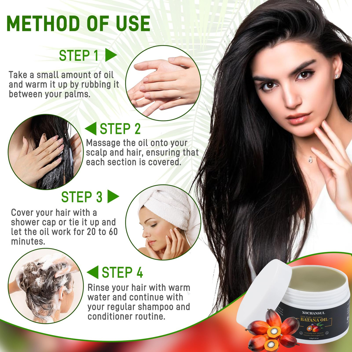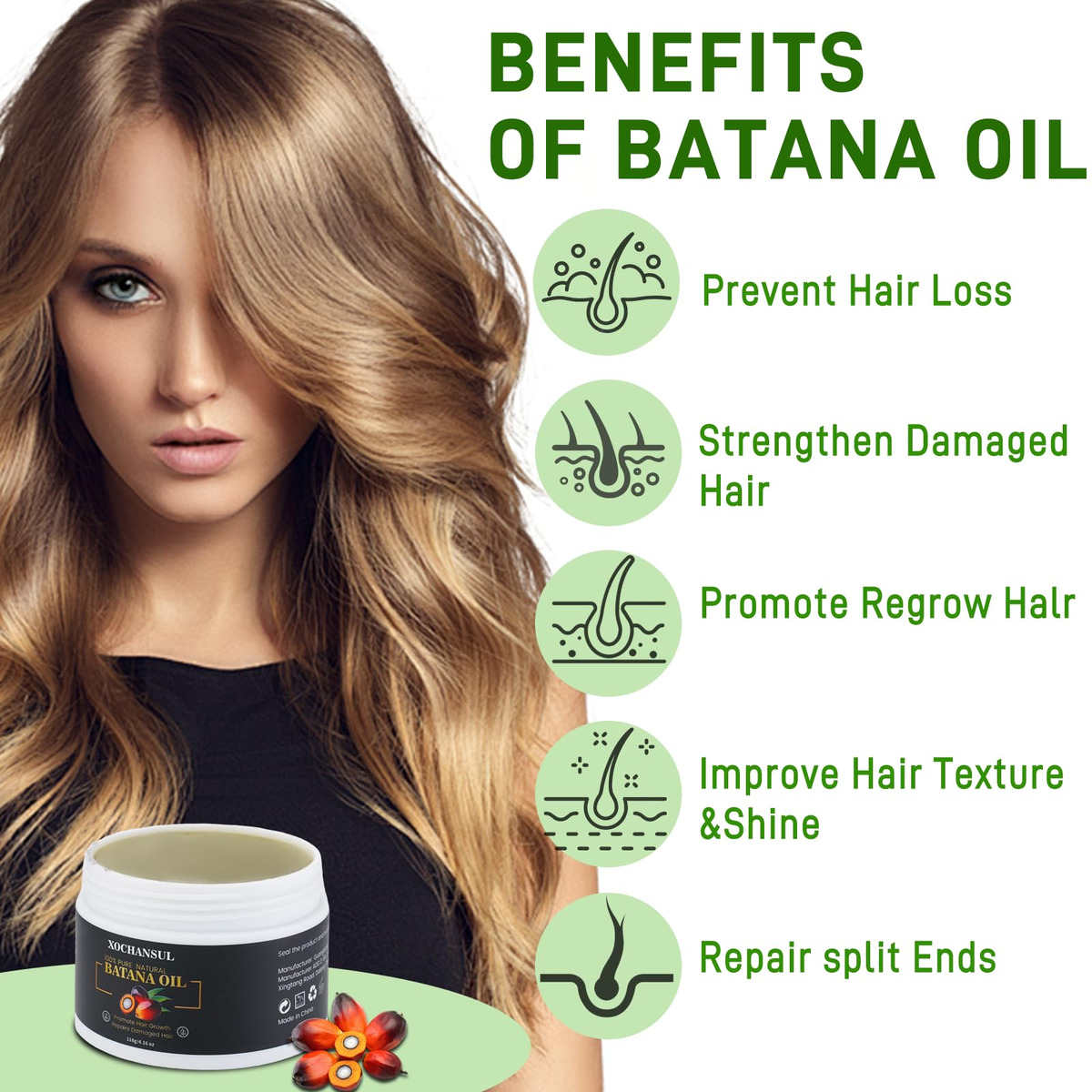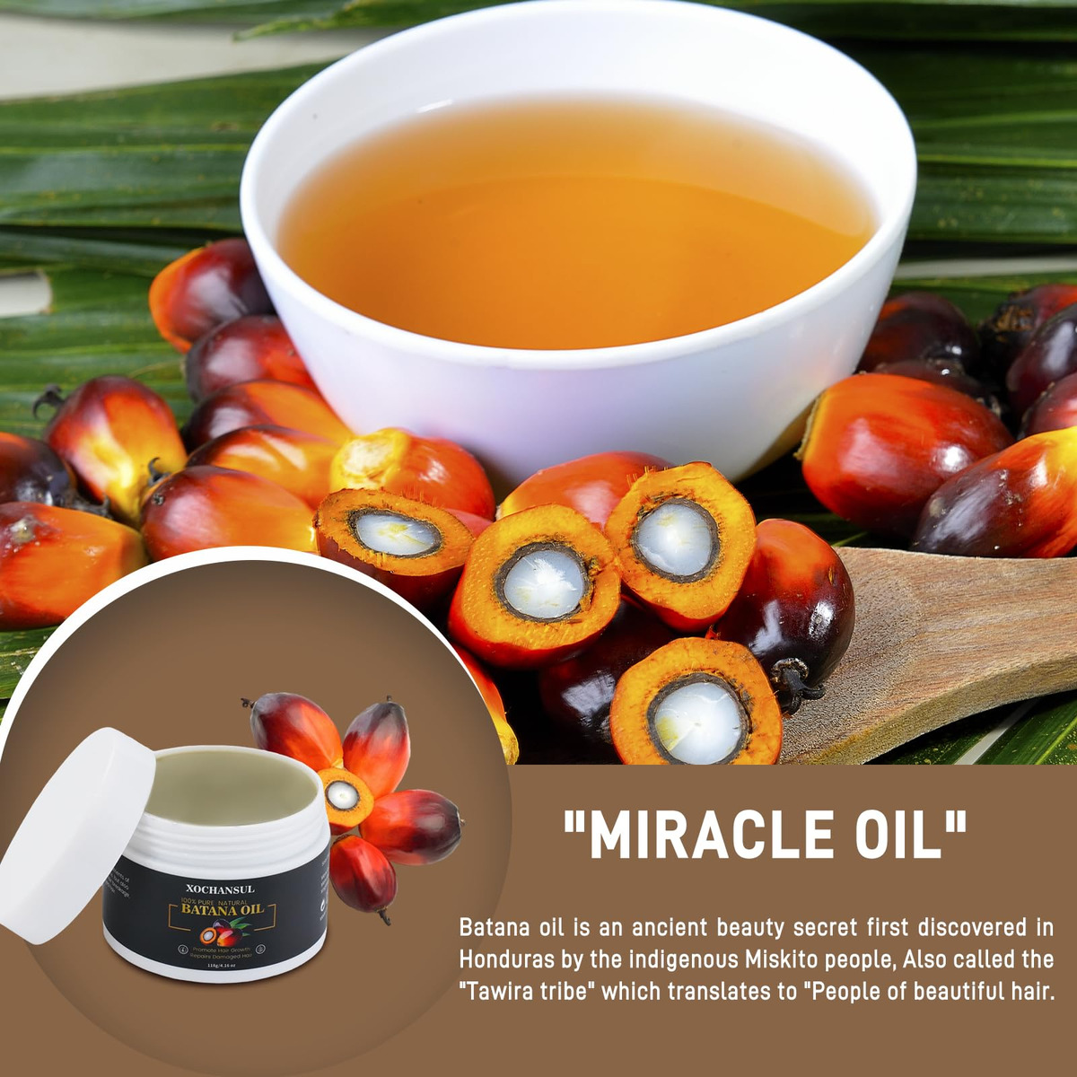 O óleo de batana é feito de ingredientes naturais. O óleo de batana é um óleo que tem sido utilizado pela tribo dos Tawira em Honduras. O óleo de batana é determinado a partir da extração do óleo do produto natural da árvore Elaeis Oleifera. O óleo de batana auxilia no desenvolvimento do cabelo, hidrata o cabelo e revitaliza o couro cabeludo. Esse óleo apreciado também tem a capacidade de hidratar, suavizar e esfoliar a pele. Este óleo de batana puro contém nutrientes naturais como ômega-6, fitoesteróis e vitamina E, que trabalham juntos para hidratar e nutrir profundamente o cabelo. Ajuda a reparar fios secos e danificados, reduz a quebra, contra pontas duplas e nós e melhora a elasticidade e o brilho. Método de uso Massageie suavemente uma quantidade generosa do óleo de batana no couro cabeludo por 3-5 minutos. Benefícios do óleo de batana As pessoas adoram o óleo de batana cru para seus cabelos porque é rico em nutrientes. Use-o regularmente como parte de sua rotina de cuidados com os cabelos para nutrir, hidratar eficazmente, estimular o crescimento do cabelo, fortalecer o cabelo, dar brilho e proteger o cabelo contra danos. – Puro e natural: extraído das nozes da palmeira americana (Elaeis Oleifera) e proveniente de Honduras, este óleo de batana cru é rico em óleo de batana em nutrientes naturais. Ele apoia o crescimento saudável do cabelo, hidrata profundamente o couro cabeludo e ajuda a reparar e rejuvenescer naturalmente os cabelos danificados. – Promove o crescimento do cabelo e previne a queda de cabelo: nosso óleo de crescimento capilar pode ajudar a reativar os folículos adormecidos e promover o crescimento do cabelo. Essa mistura natural auxilia na hidratação do couro cabeludo e ajuda a reparar os cabelos danificados, deixando os fios mais cheios e com aparência saudável. – Profundamente nutritivo: esse óleo de batana puro contém nutrientes naturais como ômega-6, fitoesteróis e vitamina E, que trabalham juntos para hidratar e nutrir profundamente o cabelo. Ajuda a reparar fios secos e danificados, reduz a quebra, contra pontas duplas e nós e melhora a elasticidade e o brilho. – Fácil de usar, massageie suavemente uma quantidade generosa do óleo de batana no couro cabeludo por 20 a 60 minutos e depois enxágue com água morna. Use-o regularmente como parte de sua rotina de cuidados com os cabelos para nutrir, hidratar, fortalecer e proteger seu cabelo contra danos. – Suporte confiável: Se você tiver algum problema ou preocupação, não hesite em nos contatar! Nossa equipe dedicada de atendimento ao cliente está sempre aqui para ajudá-lo. Faremos o nosso melhor para manter uma experiência de compra positiva para nossos clientes.