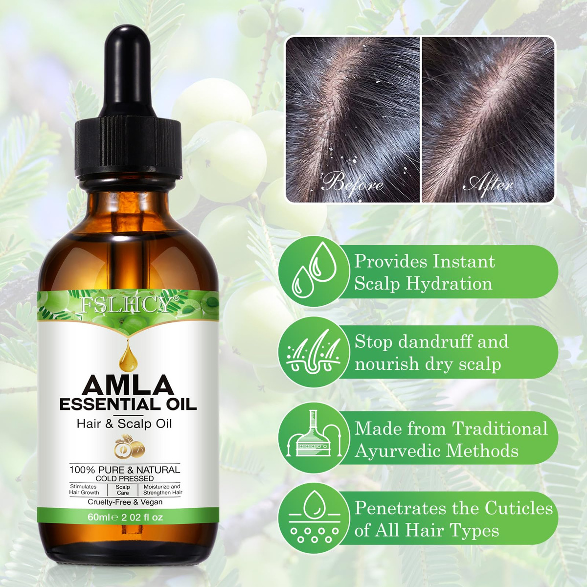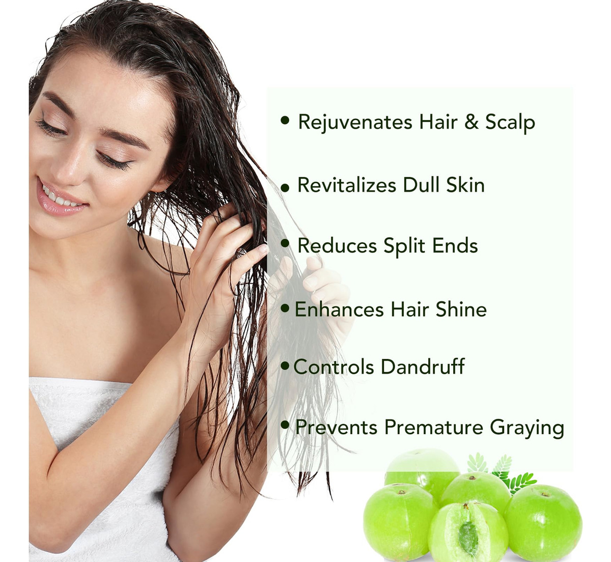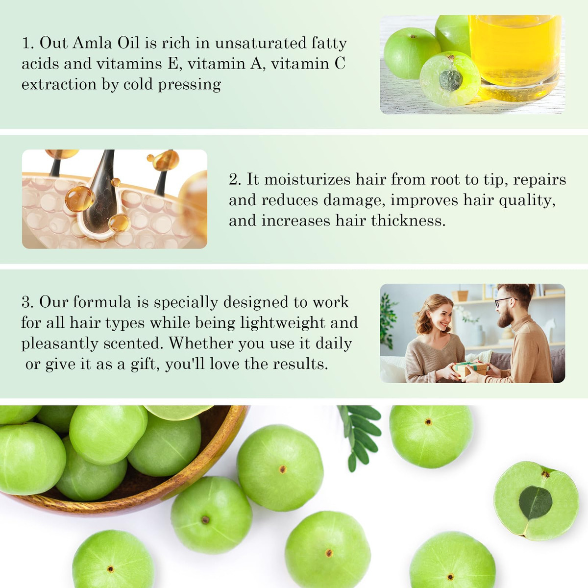 O óleo de amla, também conhecido como óleo de groselha indiana, é extraído a frio da semente da planta Emblica Officinalis. Comumente usado na Ayurveda, esse óleo marrom-amarelado é rico em vitamina C com fortes propriedades antioxidantes. Crescimento do cabelo Os fitonutrientes, vitaminas e minerais presentes na amla ajudam a aumentar a circulação do couro cabeludo e estimulam o crescimento. A vitamina C da amla produz proteína de colágeno. Isso pode ajudar a estimular o crescimento do cabelo, tanto em termos de comprimento quanto de volume. Os colágenos substituem as células mortas dos folículos pilosos por novas células ciliadas. Ajuda com a caspa A caspa geralmente é o resultado da secura. Este óleo rico em vitamina C ajuda na secura e pode limitar o acúmulo de caspa. Amlas Vitamina C, suas propriedades podem deter a caspa e também a coceira causada por ela, no couro cabeludo. Ajuda no envelhecimento dos cabelos. Amla, um refrigerante natural, é um excelente óleo para corrigir a condição de pitta, o que minimiza o envelhecimento. Fortalece o cabelo O óleo de amla serve como um tônico benéfico para a pele e o cabelo. Ele fortalece os folículos pilosos, facilitando assim o crescimento do cabelo e o fortalecimento do cabelo. Além disso, fortalece as raízes, mantém a cor e melhor brilho. – O óleo de cabelo Amla nutre, hidrata e protege os cabelos do ressecamento. Ele mantém a caspa e os grisalhos prematuros afastados. Nutre o couro cabeludo e fortalece os fios de cabelo, da raiz às pontas, para proporcionar cabelos grossos, longos e brilhantes. – Óleo de Amla 100% puro e natural. Prensado a frio. As bagas de Amla também são uma excelente fonte de vitamina C. A vitamina E, que pode ajudar a manter um couro cabeludo saudável e cabelos grossos e fortes – o óleo de Amla torna o cabelo sedoso e macio, ajuda a melhorar a saúde do cabelo, confere brilho e força às madeixas. Este óleo suaviza os cabelos crespos e os torna fluidos e fáceis de pentear. Nosso óleo Amla Hair nutre e hidrata o cabelo para proporcionar madeixas macias e flexíveis que deixam você linda. – Os ricos nutrientes em Amla facilitam a circulação sanguínea e nutrem os folículos capilares para fortalecer as raízes e minimizar a queda do cabelo. – Nosso óleo Amla Hair pode adicionar nutrição e hidratar o cabelo para proporcionar cabelos macios e flexíveis que deixam você linda. Pode ser usado por homens e mulheres que desejam manter cabelos fortes e saudáveis.