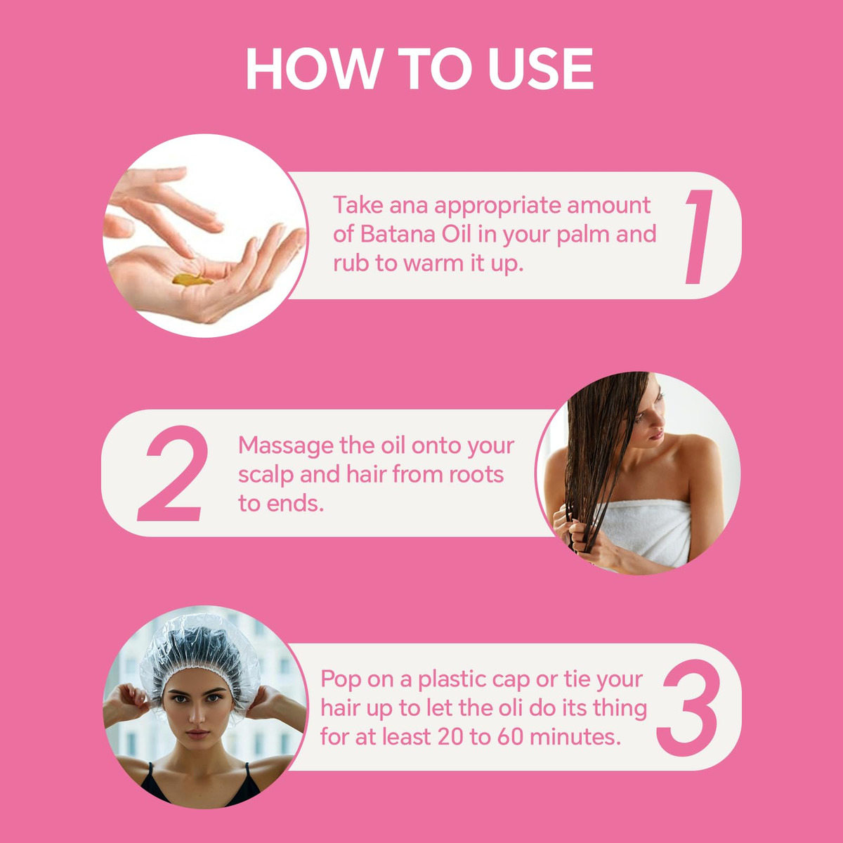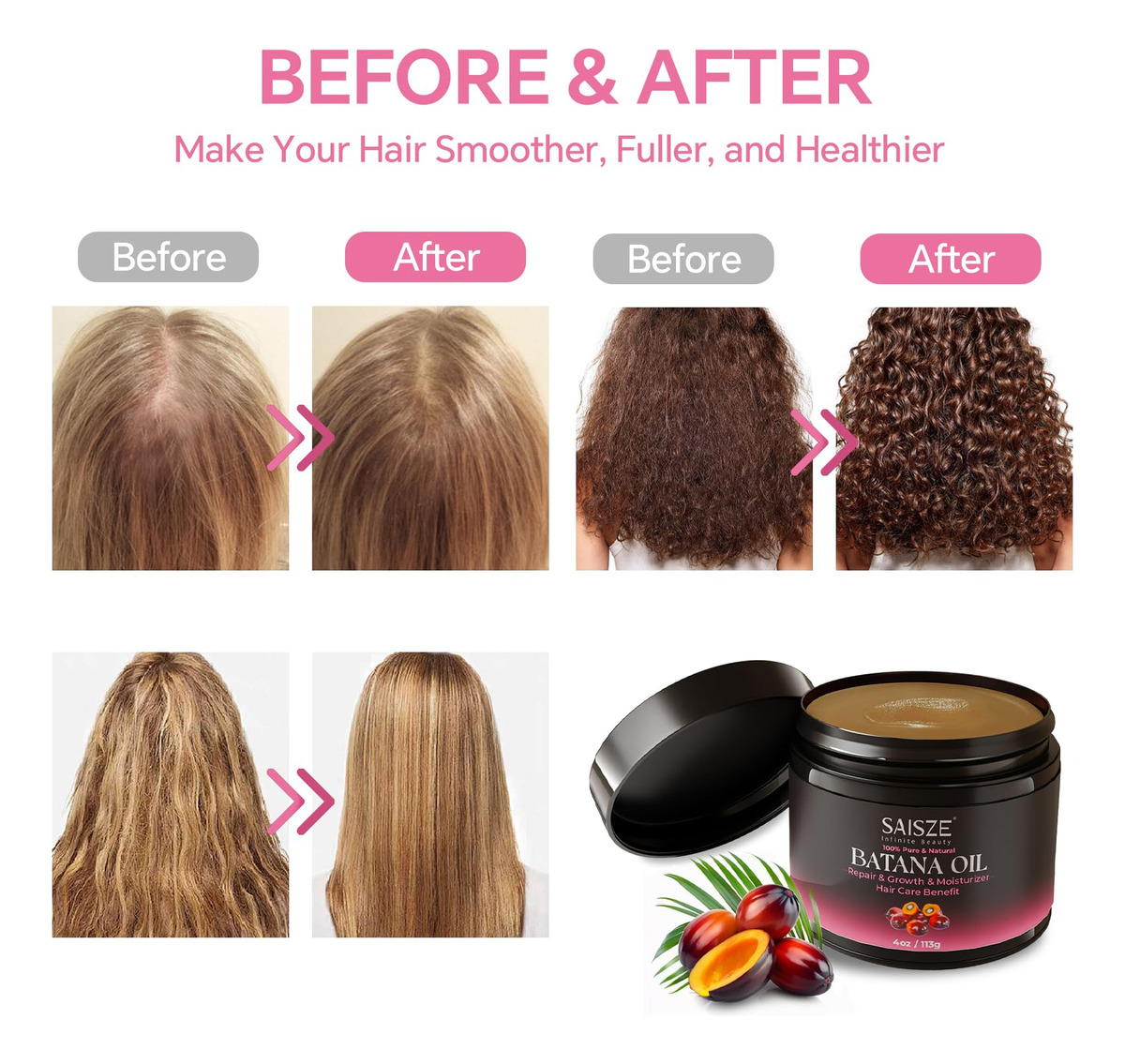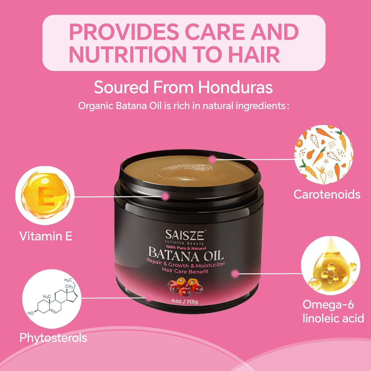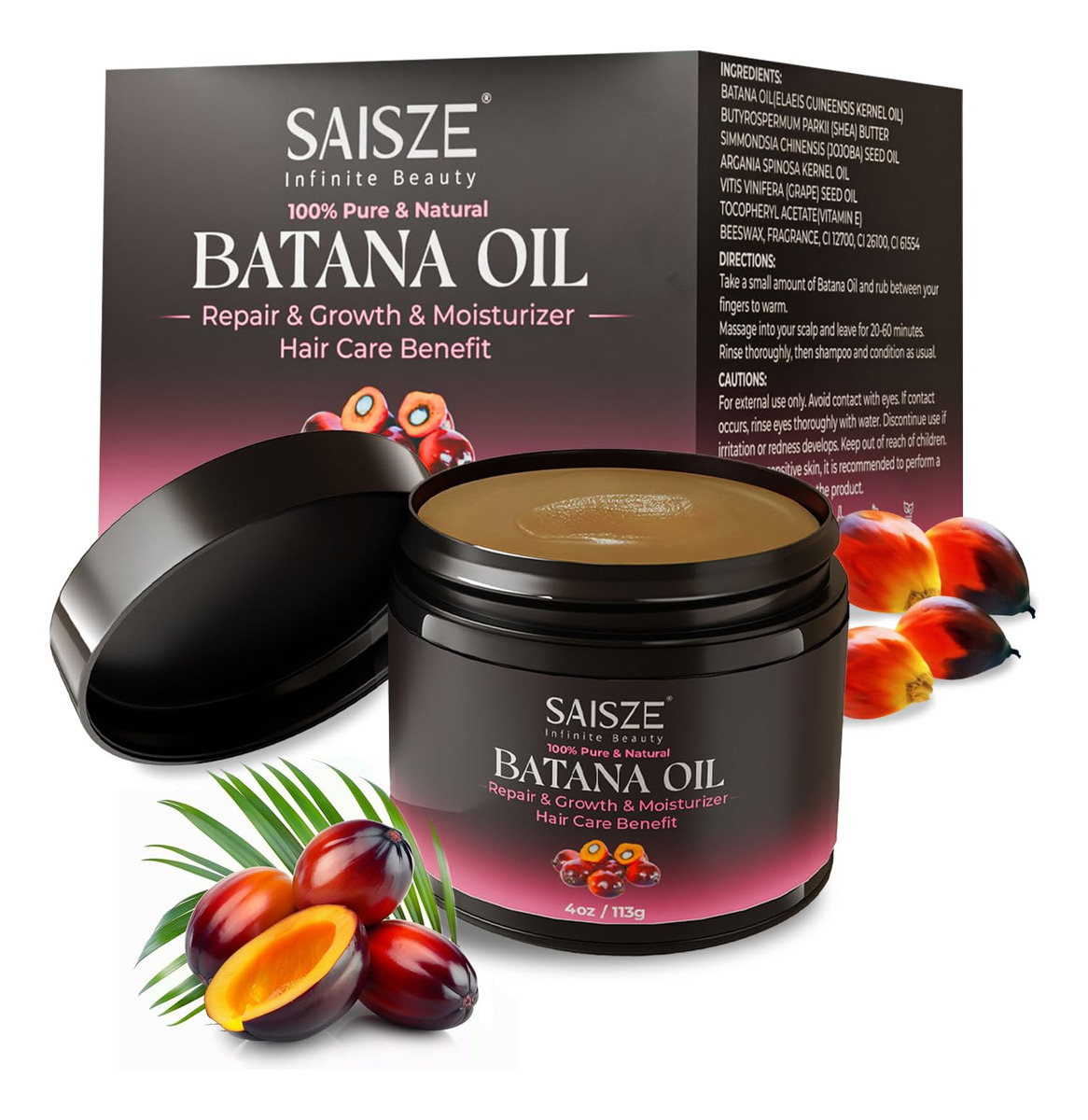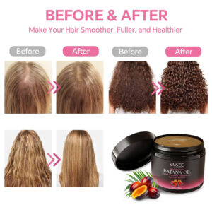 O óleo de batana SAISZE para o crescimento do cabelo aproveita o óleo puro extraído das nozes das palmeiras da América Central e do Sul, tradicionalmente usado em rituais regionais de cuidados com os cabelos. Esta fórmula à base de plantas melhora a resiliência do cabelo, reduz a quebra e nutre profundamente os fios para melhorar a textura e o brilho. Sua textura leve permite fácil aplicação, proporcionando hidratação intensiva para revitalizar a saúde do cabelo com simplicidade botânica. – Ingredientes naturais: nossa mistura contém óleo de batana cru puro e prensado a frio, famoso por seus ricos nutrientes. Aprimorado por vegetais nutritivos, como óleo natural, cada ingrediente é cuidadosamente escolhido para apoiar a saúde do cabelo e do couro cabeludo – Nutritivo e hidratante: nossa máscara capilar com óleo de batana é rica em ingredientes nutritivos, como vitamina E e ácidos graxos ômega-3, que ajudam a fortalecer o cabelo e o deixam sedoso e brilhante. Ele condiciona e hidrata profundamente, tornando os fios resistentes à quebra causada pelo estilo e pelos estressores ambientais. Evite quebras ou quebras de cabelo: experimente o cuidado suave e poderoso do óleo de crescimento capilar não refinado. Formulado com óleos penetrantes como jojoba, argan e coco, ele fortalece os fios de cabelo por dentro, evitando quebras e perdas. A inclusão de ingredientes naturais, como óleos essenciais de alecrim e hortelã, aumenta a circulação do couro cabeludo e melhora a espessura do cabelo, criando um ambiente mais saudável para o cabelo e aumenta a espessura do cabelo – Adequado para todos os tipos de cabelo: nosso óleo de batana para o crescimento do cabelo foi projetado pensando na versatilidade, atendendo a todos os tipos e texturas de cabelo. Cabelos lisos, ondulados, encaracolados e crespos se beneficiam de sua mistura nutritiva. Enriquecido com óleos essenciais e nutrientes, ele oferece hidratação, força e cuidado, garantindo que seu cabelo permaneça saudável e vigoroso – Fácil aplicação: massageie suavemente uma quantidade generosa de óleo de cabelo de botana no couro cabeludo. Coloque o cabelo em uma touca de plástico por 20 a 60 minutos e depois lave com água morna