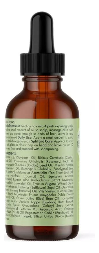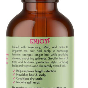 Mime seu cabelo com nosso óleo fortalecedor de cabelo e couro cabeludo com alecrim e hortelã, uma mistura luxuosa criada para resolver todas as suas preocupações com o cabelo. Esta fórmula rica em nutrientes foi projetada para nutrir os folículos capilares, suavizar as pontas duplas e aliviar os problemas do couro cabeludo seco, proporcionando um impulso revitalizante à sua rotina de cuidados com os cabelos. Repleto de ingredientes naturais e infundido com o aroma revigorante dos óleos essenciais de alecrim e menta, esse óleo de tratamento intensivo oferece o cuidado que seu cabelo realmente merece. Se você está mimando seus cabelos com um tratamento com óleo quente ou aprimorando estilos de proteção, como tranças e tecidos, nosso óleo de menta e alecrim promete deixar seu cabelo fortalecido, revigorado e maravilhosamente perfumado. Descubra hoje o segredo de um cabelo mais saudável e vibrante com nosso óleo de alecrim e fortalecimento capilar. – Restauração: restaura a função das células ciliadas evitando o couro cabeludo seco e suavizando pontas duplas com uma fórmula intensa rica em nutrientes. – Tipo de cabelo: formulado para todos os tipos de cabelo. – Sinta-se bem: obtenha cabelos mais longos, fortes e saudáveis com nosso óleo capilar orgânico infundido com biotina. – Ingredientes totalmente naturais: feito com ingredientes naturais e orgânicos, funciona não contém produtos químicos ou conservantes nocivos.