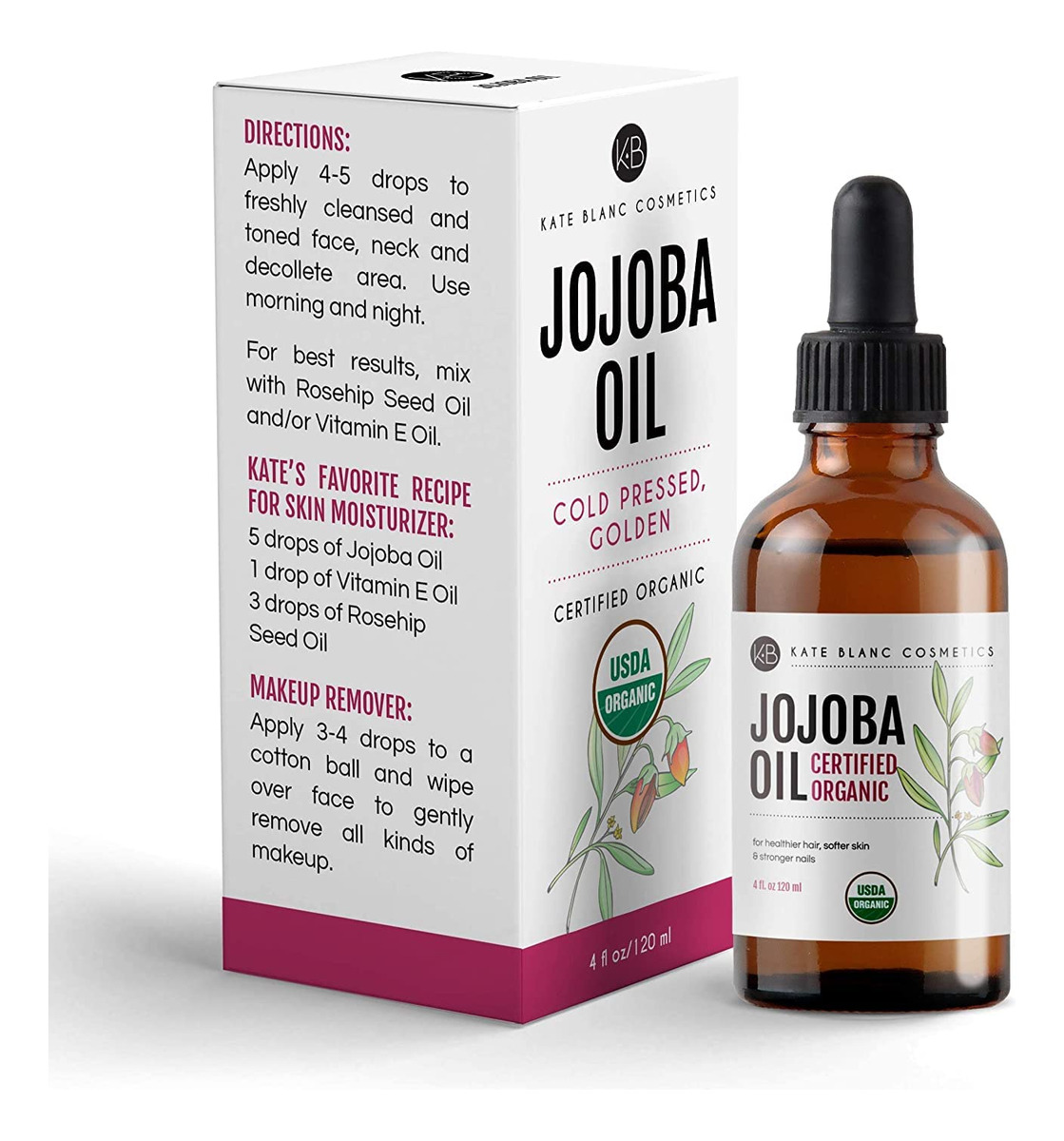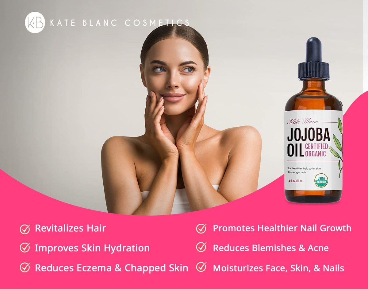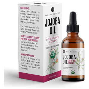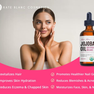 Óleo de jojoba orgânico certificado pelo USDA para uma pele mais lisa e cabelos saudáveis. Se você está procurando um óleo natural e orgânico para revitalizar seu cabelo e dar à sua pele seca ou oleosa uma aparência radiante e vibrante, o óleo de jojoba orgânico da Kate Blanc é uma dádiva de Deus. Nossos compradores adoram, assim como você, sua pele e cabelo. Este óleo deixará sua pele e cabelo deslumbrantes, vibrantes e cheios de elogios. – ÓLEO DE JOJOBA ORGÂNICO PARA CABELOS – O óleo de jojoba orgânico prensado a frio Kate Blancs (óleo de jojoba) é certificado pelo USDA e é puro, natural e sem hexano. Resultados comprovados para suavizar a pele, dando-lhe uma aparência radiante e energética. – ÓLEO DE JOJOBA ORGÂNICO PARA PELE – Perfeito como hidratante diário ou tratamento para pele, cabelos e unhas. O óleo de jojoba não refinado é facilmente absorvido pela pele e ajuda a reduzir a aparência de rugas, estrias e maquiagem. O óleo de jojoba é comumente usado como óleo corporal para pele seca e normal e óleo de cabelo para cabelos secos. É ótimo como protetor labial e para remover queimaduras solares. O óleo de jojoba pode ser usado para alongar orelhas, couro cabeludo, unhas e cutículas. – ÓLEO DE JOJOBA PARA O CRESCIMENTO DO CABELO – Cresça cabelos mais longos e grossos de forma rápida e natural, além de diminuir a queda de cabelo. O óleo de jojoba puro é um óleo natural para cutículas, cabelos secos e quebradiços, couro cabeludo seco e caspa. O óleo natural de jojoba também é ótimo como óleo de barba e para homens e mulheres. É o ingrediente popular em sérum de crescimento capilar, tratamento labial e xampu natural. – ÓLEO FACIAL PURO E ÓLEO FACIAL – O óleo de jojoba melhora a hidratação e elasticidade da pele. Pode ser usado como óleo de gua sha para massagem gua sha. O óleo de jojoba mantém o rosto e o corpo hidratados e reduz manchas, acne, espinhas, cicatrizes, rosácea, eczema, psoríase, pele rachada e linhas finas sem deixar a pele seca. O óleo de jojoba puro é um ótimo óleo orgânico para o cabelo e atua como um hidratante sem óleo para reparar o cabelo. O óleo de jojoba pode ser usado para fazer sabonetes e protetores labiais.