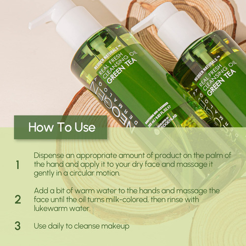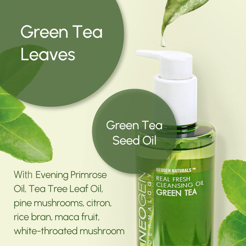 Um óleo de limpeza contendo extratos reais visíveis de folhas de chá verde! Contendo ingredientes de catequina (antioxidantes) de folhas reais de chá verde que acalmam e hidratam com eficácia, além de criar uma base saudável para a pele. – O verdadeiro chá verde e o óleo de limpeza se unem para refrescar e acalmar a pele, além de apagar perfeitamente a maquiagem! – Um óleo de limpeza contendo extratos visíveis de folhas de chá verde reais: contém ingredientes de catequina (antioxidantes) de folhas de chá verde reais que efetivamente acalmam e fornecem hidratação, além de criar uma base de pele saudável. – Contém fórmula hidratante para hidratação natural e sem sensação de ressecamento posterior: este óleo de limpeza contém ingredientes hidratantes obtidos da natureza, como cogumelos de pinho, cidra, farelo de arroz, maca e cogumelo de garganta branca para criar uma pele saudável barreira de hidratação. – Um limpador de óleo e PHA derivado de plantas que limpa suave e gentilmente: os óleos exclusivos derivados de plantas da Neogen (óleo de semente de chá verde, óleo de prímula, óleo de folha de melaleuca) são misturados para reduzir a irritação na pele sensível. Ele dissolve instantaneamente maquiagem, impurezas, cravos e células mortas da pele, enquanto limpa os poros e ajuda a manter o nível de umidade para uma tez radiante. – Sensação macia e confortável com textura de óleo espessa de alta viscosidade: uma fórmula rica em óleo que adere firmemente à pele e, quando massageada suavemente, limpa profundamente os poros.