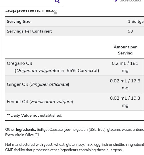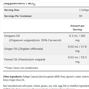 Óleo de funcho, Óleo de gengibre, Aceite de orégano, Água, Algarroba) e azeite de oliva extra virgem, Cápsula de gelatina (gelatina, Glicerina, Revestimento entérico |