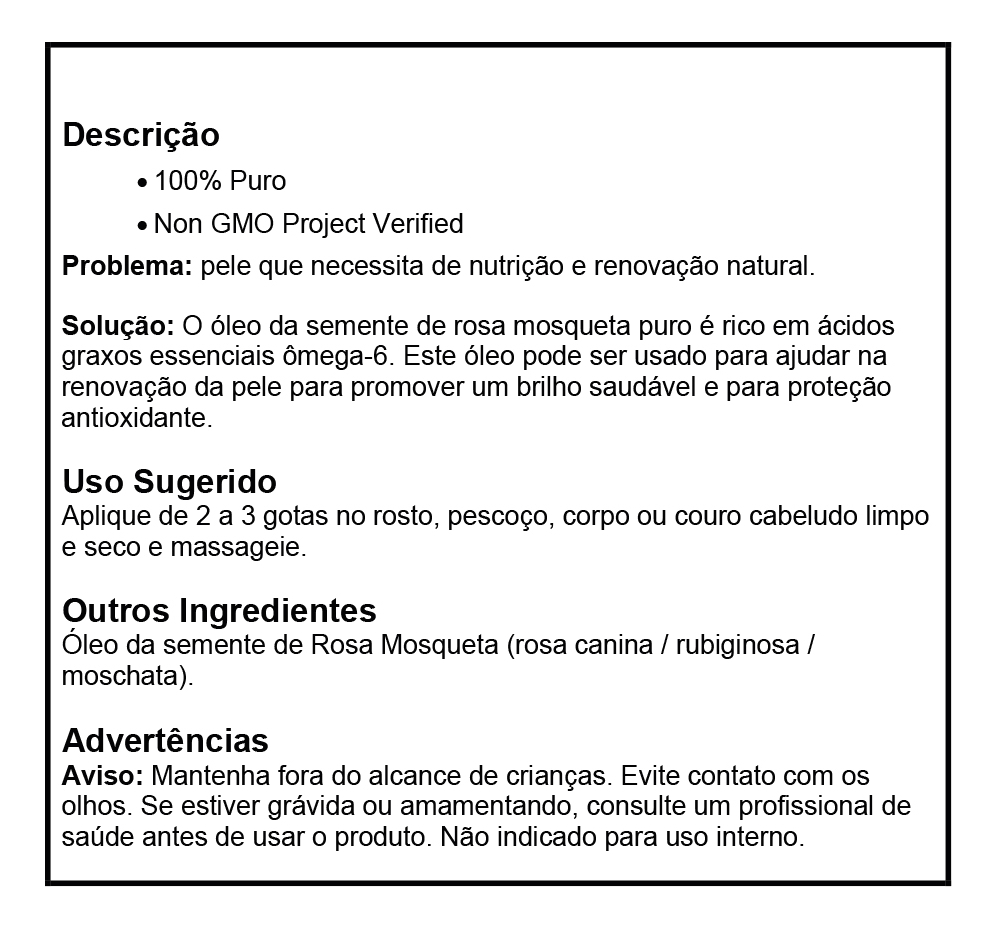 4. Fácil Integração na Rotina Diária: O Óleo de Semente de Rosa Mosqueta pode ser facilmente adicionado à sua rotina diária de cuidados pessoais. Sua aplicação é simples e pode ser feita diretamente na pele, oferecendo uma maneira conveniente de incorporar este produto no seu dia a dia.