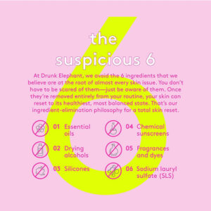 Drunk Elephant está comprometida em usar apenas ingredientes limpos que beneficiem diretamente a saúde da pele ou apoiem a integridade e eficácia de suas fórmulas.