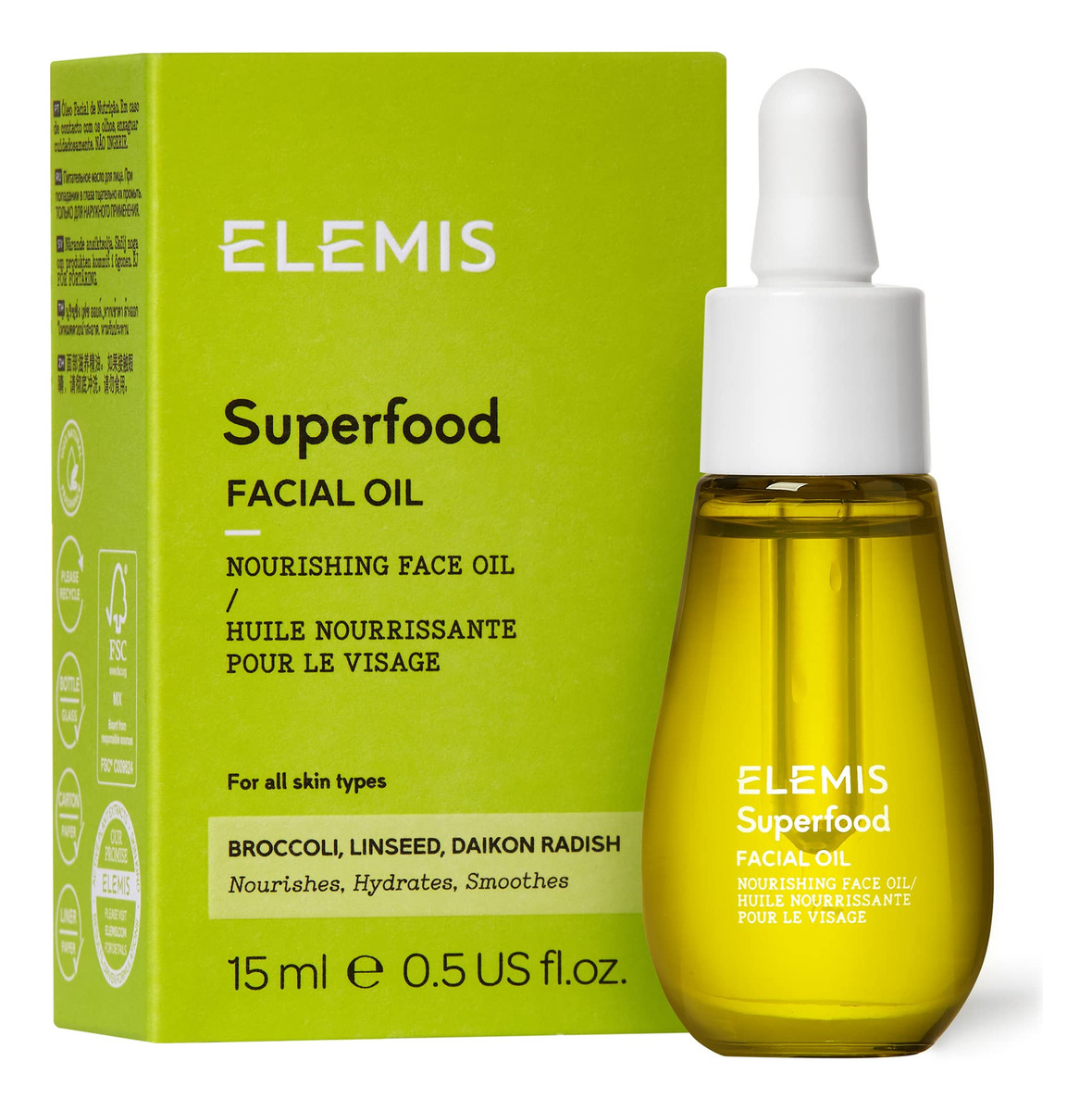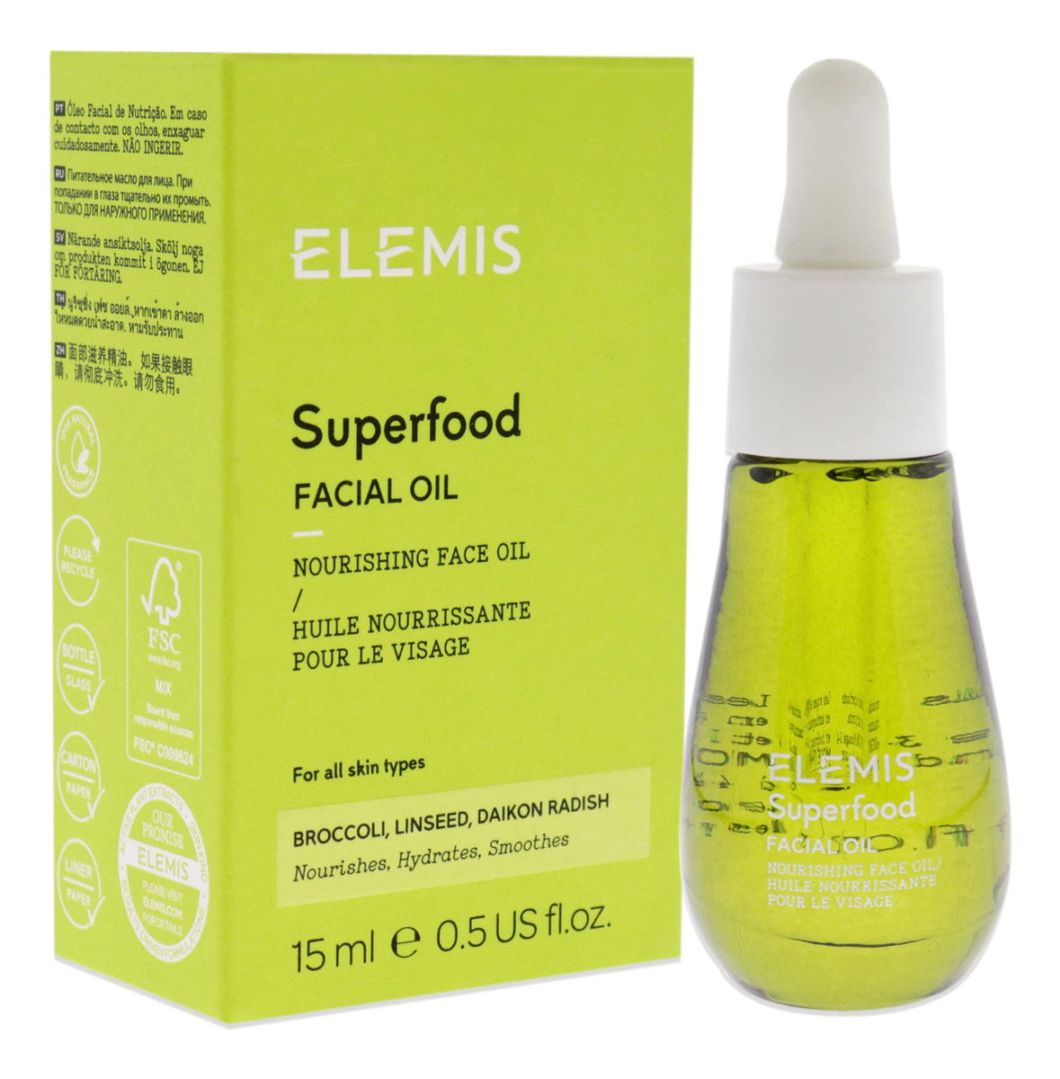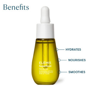 O óleo facial superalimento ELEMIS, concentrado, leve e nutritivo para uso diário, hidrata e suaviza a pele para uma pele saudável e brilhante — A embalagem pode variar — Hidrata — Suaviza — Suaviza — Suaviza