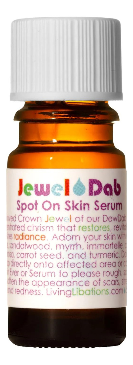 A joia da coroa de nossa família DewDab é Living Libations Jewel Dab, um crisma concentrado criado para restaurar, revitalizar e restabelecer o brilho. Decore uma gota de joia diretamente na pele, para saciar a pele sem brilho, agradar a pele áspera e suavizar a aparência de cicatrizes, estrias e relaxar a vermelhidão. Jewel Dab foi criado com essas gemas reabastecedoras para tonificar a aparência da textura da pele: RockRose para regenerar, sândalo para acalmar a secura, mirra para minimizar a linha fina, Immortelle para estimular a elasticidade, camomila para acariciar o inchaço, palmarosa para acalmar a vermelhidão, semente de cenoura para suavizar cicatrizes e açafrão para uniformizar o tom da pele. – O QUE É: uma mistura de óleos essenciais puros criada para restaurar, revitalizar e restabelecer o brilho. – O que faz: criada com essas gemas reabastecedoras para tonificar a aparência da textura da pele. – BENEFÍCIOS: Feito para: ajudar na regeneração da pele, Suaviza o ressecamento, minimize as linhas finas, promove elasticidade e suaviza as cicatrizes. — QUALIDADE: ingredientes naturais, orgânicos e artesanais, feitos à mão em pequenos lotes; pequenas variações de cor, consistência e aroma são normais ou esperadas dos produtos naturais. — LIMPO: engarrafado em vidro reciclável, sem parabenos, sem sulfato, sem crueldade e sem glúten.