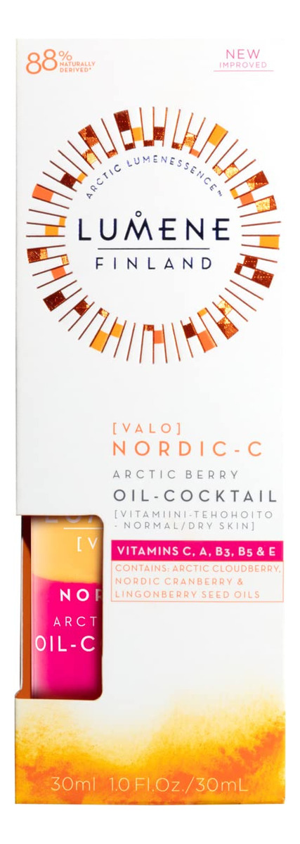 Óleo facial Lumene Nordic-C [Valo] Arctic Berry — Sérum hidratante rico em antioxidantes com vitamina C, vitamina E e ácido hialurônico — Reabastece e dá volume à pele seca — Cuidados com a pele veganos (30 ml) — Reabasteça o brilho da pele — Dê à pele a hidratação que ela merece com o óleo facial Lumene de vitamina C. Com uma fórmula bifásica exclusiva que combina uma mistura de frutas vermelhas nórdicas ricas em antioxidantes com ácidos graxos e vitaminas essenciais, este sérum antioxidante nutritivo oferece uma tez perfeitamente hidratada, radiante e aveludada. – Retenha um brilho jovem – Repleto de ingredientes que proporcionam uma pele brilhante, este sérum facial de vitamina C contém uma forma rara de vitamina E e óleo de semente de cranberry ártico, que ajuda a reter o equilíbrio de umidade da pele. – Coquetel de hidratação – A água pura da nascente do Ártico inunda sua pele com hidratação e suavidade enquanto o Ártico Selvagem Cloudberry energiza e ilumina sua pele. Ele também contém fontes naturais de potentes vitaminas A e E. – Atualize seu regime de cuidados com a pele – Para usar, agite bem o sérum de vitamina C e aplique no rosto e pescoço após a limpeza. Use nosso hidratante facial Nordic-C Glow para dobrar a hidratação e o brilho. – Pioneiros da beleza circular – Nossa jornada começou com um ingrediente local reciclado – o raro e poderoso Cloudberry. Desde então, a natureza e a sustentabilidade nórdicas estão presentes na estrutura central de nossa missão. Na Lumene, temos o compromisso de trabalhar em harmonia com a natureza e eliminar o desperdício em cada etapa do processo de produção de nossos produtos para cuidados com a pele facial.