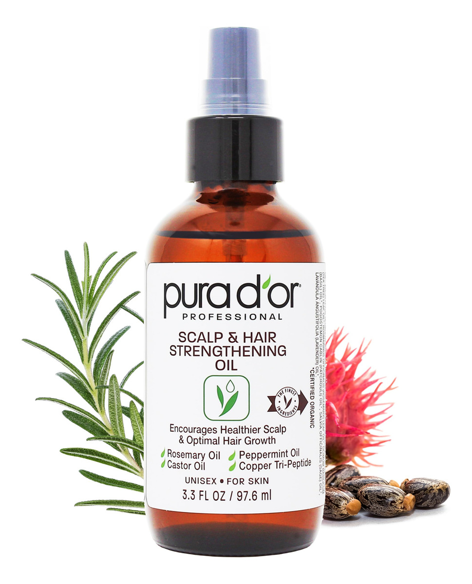 Óleo fortalecedor de couro cabeludo e cabelo PURA D'OR de 3,3 onças – Promove o crescimento ideal, reduz a quebra, nutre as raízes para cabelos mais saudáveis, cheios e espessos – Óleo de alecrim, rícino e hortelã para fios mais fortes – Estimula o crescimento do cabelo: estimula o crescimento do cabelo: estimula o crescimento do cabelo: estimula o crescimento do cabelo espessura com os benefícios nutritivos do óleo de coco e do óleo de melaleuca, promovendo um couro cabeludo mais saudável e estimulando um cabelo ideal crescimento. – Magia do óleo de alecrim: aproveite as propriedades naturais estimulantes do cabelo do óleo de folha de alecrim, conhecido por melhorar a circulação e estimular os folículos pilosos para um crescimento capilar mais forte e saudável. – Elixir de óleo de rícino: rejuvenesça o couro cabeludo e o cabelo com as propriedades nutritivas do óleo de rícino, rico em ácidos graxos e antioxidantes, promovendo o crescimento natural do cabelo e combatendo a queda de cabelo devido à quebra. – Óleo de hortelã Aprecie a sensação refrescante do óleo de hortelã, suavizando o couro cabeludo e deixando seu cabelo revitalizado e rejuvenescido.