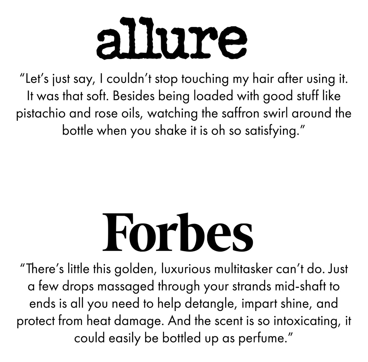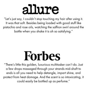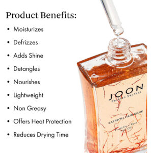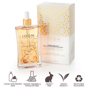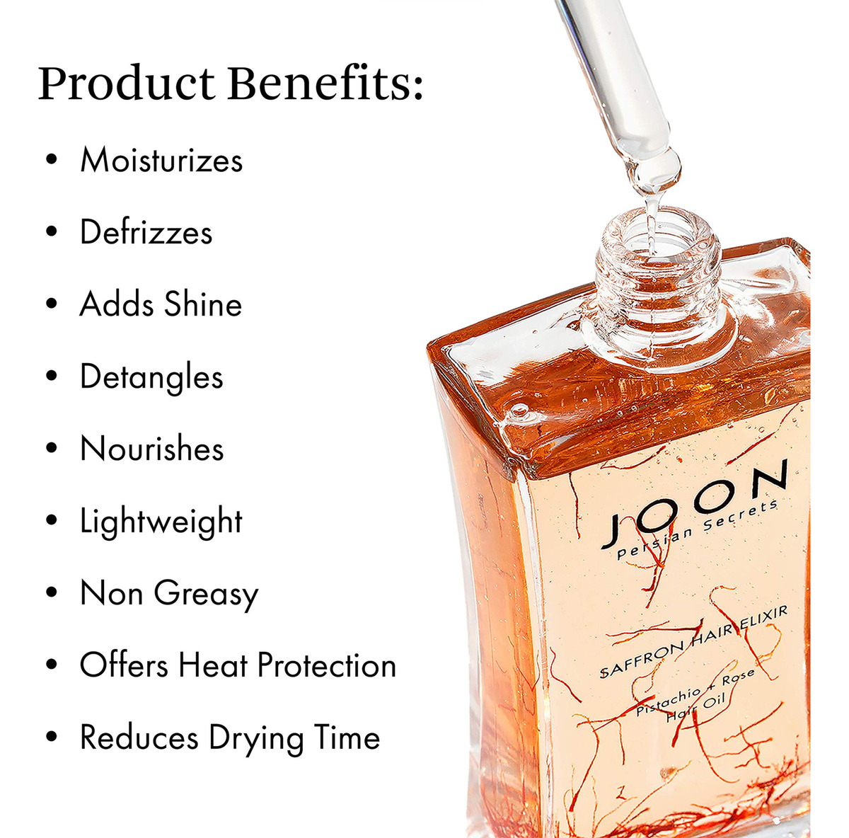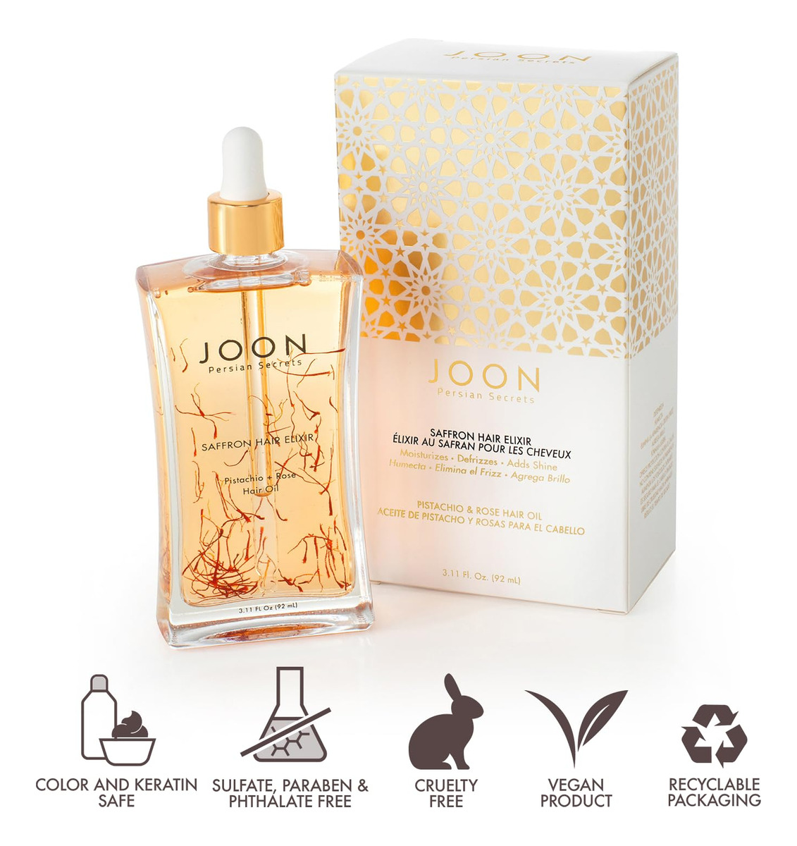 Joon é uma linha de tratamento capilar que combina segredos persas antigos com química moderna para cabelos saudáveis. Um óleo de cabelo leve e de rápida absorção que hidrata e desembaraça para um cabelo brilhante e sem frizz. Hidrata, desfriza, dá brilho, desembaraça, formulação leve. Coloque algumas gotas na mão, esfregue as mãos e distribua uniformemente o produto no meio do eixo e nas pontas. Os persas usam açafrão, pistache e rosa em rituais de beleza há séculos. O açafrão, um tempero que vale mais do que seu peso em ouro, é usado para fortalecer o cabelo. O pistache promove ácidos graxos, proteínas e vitaminas que nutrem e hidratam para um cabelo macio e elástico. Adorada na poesia e na arte persas, a rosa é usada há muito tempo para ajudar na reparação do cabelo. Esses ingredientes exclusivos, agora combinados com a química moderna, dão um impulso potente ao cabelo. – Hidrata e desfriza – Dá brilho e desembaraça – Oferece proteção térmica e reduz o tempo de secagem
