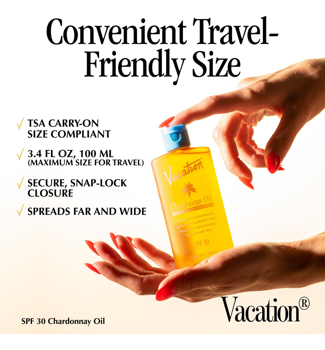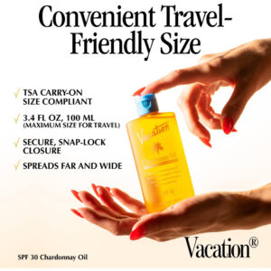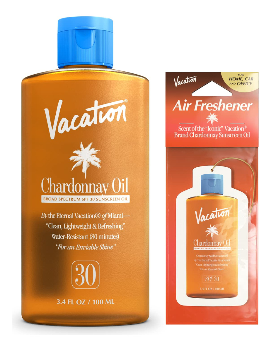 Um óleo protetor solar leve com FPS 30 feito de óleo de semente de uva chardonnay que oferece um brilho invejável e sutil enquanto hidrata e protege a pele. '- Óleo protetor solar SPF30 adequado para viagens – Um óleo protetor solar portátil de 3,4 onças feito de óleo de semente de uva chardonnay que oferece um brilho sutil e invejável enquanto hidrata e protege a pele. Com uma mistura elegante de óleo de semente de uva Chardonnay, superóleos luxuosos e ativos SPF30, o óleo de Chardonnay oferece proteção ideal e inveja ideal dos espectadores. Substitua os óleos bronzeadores gordurosos e questionáveis do passado pela sensação limpa do óleo de semente de uva Chardonnay e pelo melhor em proteção SPF 30. – TRANSPARENTE EM TODOS OS TONS DE PELE – Formulado especificamente para ser invisível em todos os tons de pele e, ao mesmo tempo, oferecer um brilho sutil e sofisticado que melhora a aparência da pele do usuário em tempo real e em fotos. – SENSAÇÃO DE LIMPEZA E LEVEZA – Formulado com óleos naturais não adulterados, leves e invisíveis em todos os tons de pele sem deixar a pele pegajosa. Nosso óleo bronzeador protetor solar contém ingredientes hidratantes e nutritivos, incluindo: óleo de semente de uva Chardonnay, óleos de semente de marula e maracujá, óleo de jojoba e karité, vitamina E e bisabolol. – PERFUME MUNDIALMENTE FAMOSO – Contém o famoso perfume Vacation Grand Cru 86 desenvolvido em conjunto com a ARQUISTE Parfumeur – um perfume que permitirá que você desfrute da verdadeira elegância com nosso óleo bronzeador para o sol ao ar livre, ao mesmo tempo que oferece à sua pele a melhor proteção solar. – Compatível com HAWAII REEF – Contém protetores solares SPF 30 de amplo espectro de alto desempenho feitos para aderir aos 104 mandatos da Lei de Conformidade com os Recifes do Havaí.