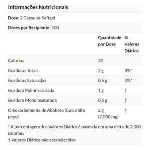 Forma Prática: Apresentado em cápsulas gelatinosas de 1000mg, o óleo de semente de abóbora da Now Foods é facilmente incorporado à rotina diária.