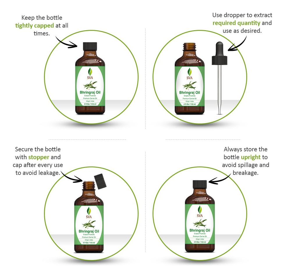 Óleo Bhringraj – Óleo transportador de qualidade premium: O óleo SVA Bhringraj é obtido pela extração prensada a frio das folhas de Eclipta Prostrata. Nosso óleo Bhringraj é livre de conservantes e vem com um conta-gotas para facilitar a aplicação. Não é testado em animais. Nós cuidamos de você! – Como usar: O óleo SVA Bhringraj é fácil de usar. Coloque algumas gotas na palma da mão e massageie suavemente no couro cabeludo por alguns minutos. Deixe agir por 30 minutos e lave o cabelo com um shampoo suave. Você pode deixar o óleo no cabelo durante a noite para obter melhores resultados. – Cuidados com o cabelo: o óleo Bhringraj é usado para massagem no cabelo e no couro cabeludo. Aqueça o óleo e aplique no cabelo e no couro cabeludo. Enrole uma toalha ou touca de banho para uma penetração profunda. Você também pode usá-lo misturando algumas gotas de óleo de Bhringraj com seu xampu, condicionador e máscara para cuidar do cabelo. – Nutrição da pele: o óleo Bhringraj é adequado para massagem e pode ser usado como hidratante. Pode ser usado sozinho ou misturado com outro óleo para uma massagem. Adicione algumas gotas aos seus cremes, loções ou produtos de banho para obter a qualidade do óleo Bhringraj. – Satisfação do cliente: A SVA está comprometida em fornecer aos clientes produtos de alta qualidade que proporcionam uma experiência extraordinária. A satisfação do cliente é nosso foco principal e continuamos a oferecer a qualidade genuína pela qual somos conhecidos.