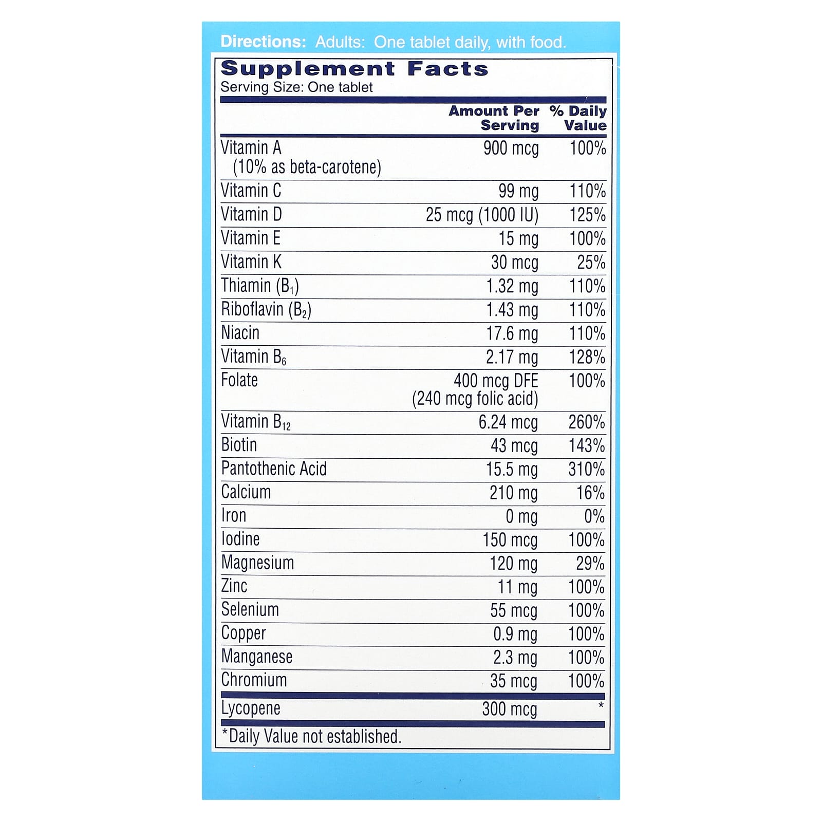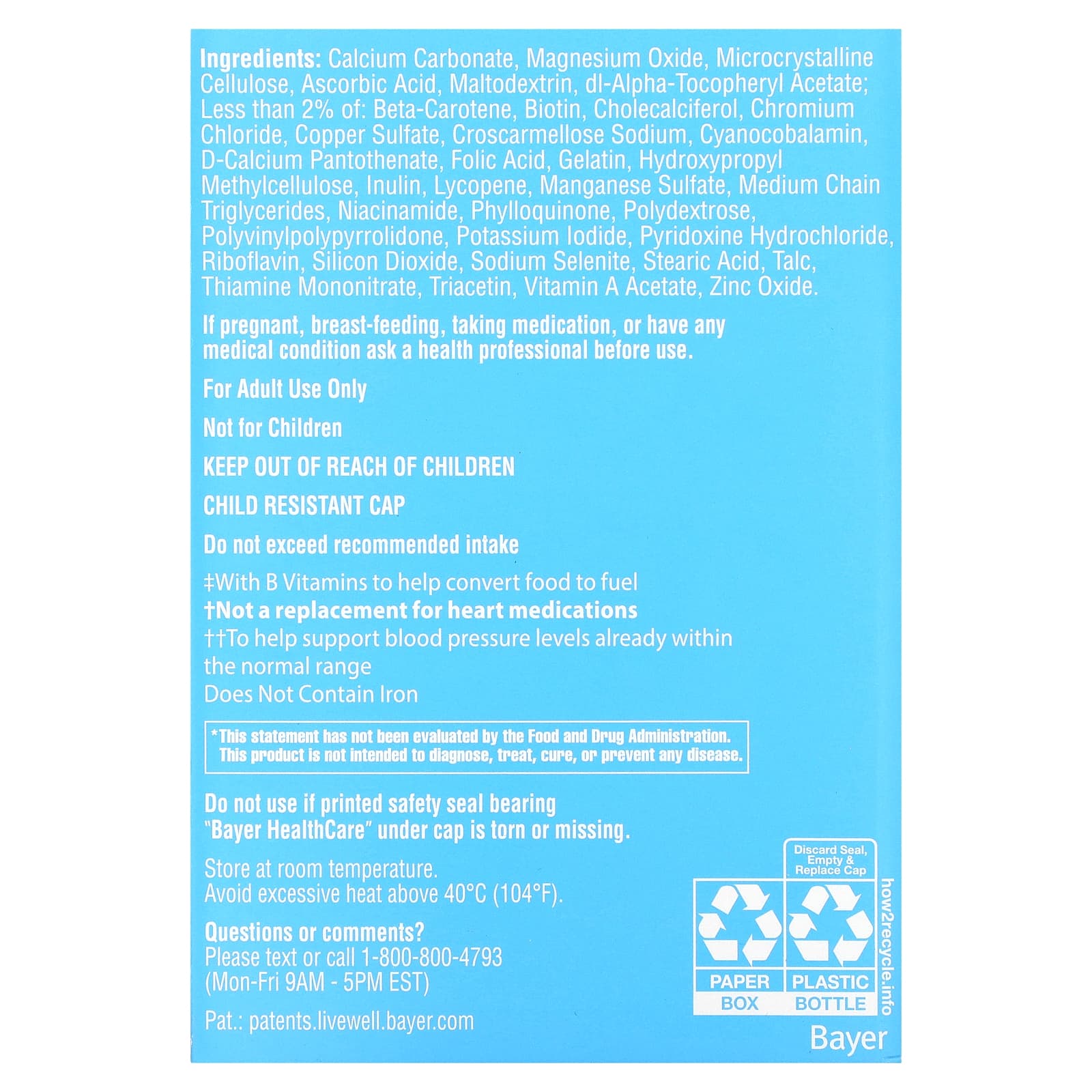 Carbonato de cálcio, óxido de magnésio, celulose microcristalina, ácido ascórbico, maltodextrina, acetato de dl-alfa-tocoferol; menos de 2% de: betacaroteno, biotina, colecalciferol, cloreto crômico, sulfato cúprico, croscarmelose sódica, cianocobalamina, pantotenato de cálcio, ácido fólico, gelatina, hipromelose, inulin, licopeno, sulfato de manganês, triglicerídeos de cadeia média, nicotinamida, fitomenadiona, polidextrose, polyvinylpolypyrrolidone, iodeto de potássio, cloridrato de piridoxina e riboflavina, dióxido de silício, selenito de sódio, ácido esteárico, talco, nitrato de tiamina, triacetina, acetato de vitamina A, óxido de zinco.