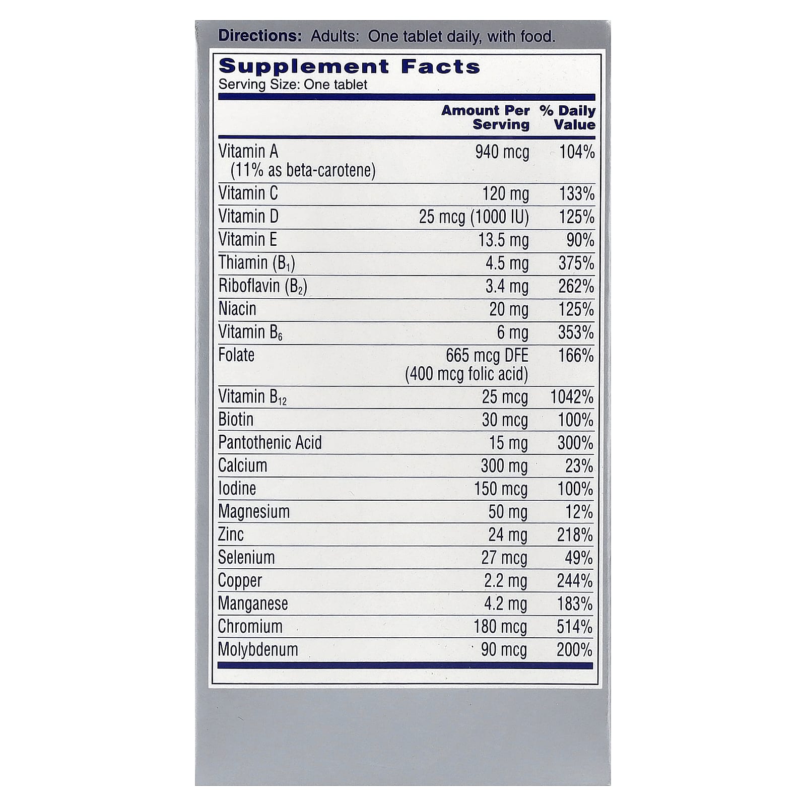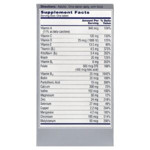 Carbonato de cálcio, celulose microcristalina, ácido ascórbico, óxido de magnésio, maltodextrina, óxido de zinco, acetato de racealfatocoferol; menos de 2% de: sabor artificial, betacaroteno, biotina, colecalciferol, cloreto de cromo, sulfato de cobre, croscarmelose sódica, cianocobalamina, pantotenato de cálcio, amarelo crepúsculo tartrazina) laca de alumínio, amarelo crepúsculo laca de alumínio, ácido fólico, gelatina, hidroxipropilmetilcelulose, sulfato de manganês, nicotinamida, macrogol, iodeto de potássio, cloridrato de piridoxina, riboflavina, dióxido de silício, molibdato de sódio, selenito de sódio, ácido esteárico, mononitrato de tiamina, dióxido de titânio (corante), acetato de vitamina A.
