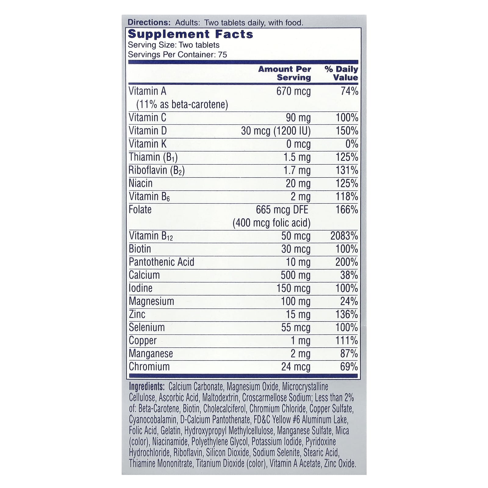 Carbonato de cálcio, óxido de magnésio, celulose microcristalina, ácido ascórbico, maltodextrina, croscarmelose sódica; menos de 2% de: betacaroteno, biotina, colecalciferol, cloreto de cromo, sulfato de cobre, cianocobalamina, pantotenato de cálcio, amarelo crepúsculo laca de alumínio, ácido fólico, gelatina, hidroxipropilmetilcelulose, sulfato de manganês, mica (corante), nicotinamida, macrogol, iodeto de potássio, cloridrato de piridoxina, riboflavina, dióxido de silício, selenito de sódio, ácido esteárico, mononitrato de tiamina, dióxido de titânio (corante), acetato de vitamina A, óxido de zinco.