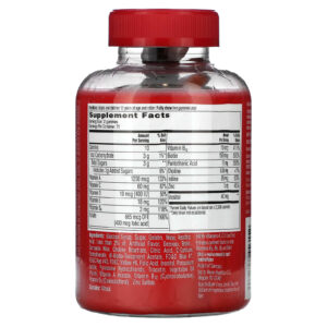 Xarope de glicose, açúcar, gelatina, água, ácido ascórbico; menos de 2% de: sabor artificial, cera de abelha, biotina, cera de carnaúba, hemitartarato de colina, ácido cítrico, pantotenato de cálcio, acetato de dextroalfatocoferol, fd & amp; c azul # 1 fd & amp; c vermelho # 40, amarelo crepúsculo, ácido fólico, inositol, iodeto de potássio, cloridrato de piridoxina, triacetina, óleo vegetal (palma), acetato de vitamina A, vitamina b12 (cianocobalamina), vitamina D3 (colecalciferol), sulfato de zinco.