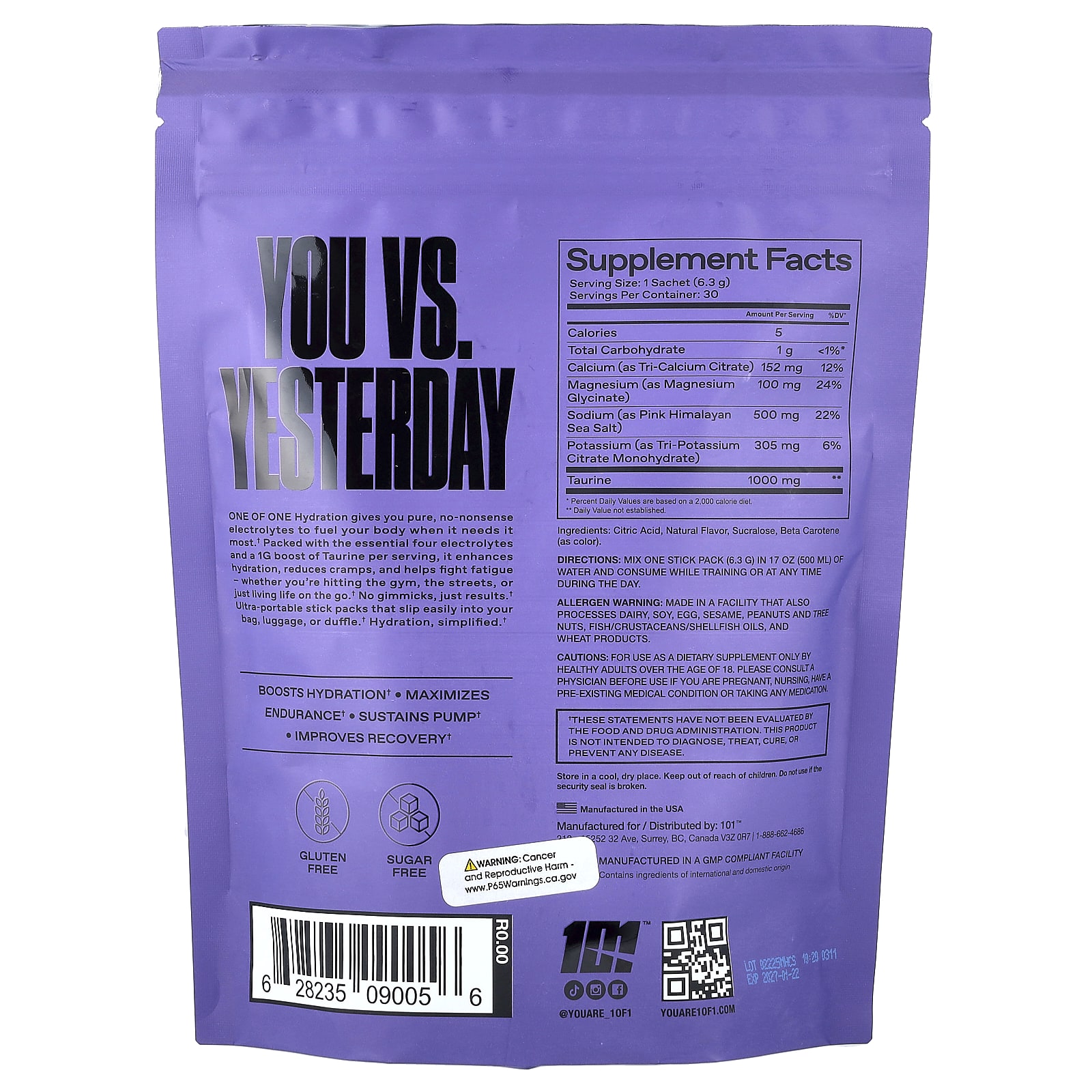 ONE OF ONE A Hidratação fornece eletrólitos puros e práticos para abastecer seu corpo quando ele mais precisa. Embalado com os quatro eletrólitos essenciais e um reforço de 1 g de Taurina por dose, ele melhora a hidratação, reduz cãibras e ajuda a combater a fadiga, esteja você indo para a academia, para as rua ou apenas para levar a vida em qualquer lugar. Sem Truques, apenas resultados. Embalagens ultraportáteis que deslizam facilmente na sua bolsa, mala ou bolsa. Hidratação simplificada.