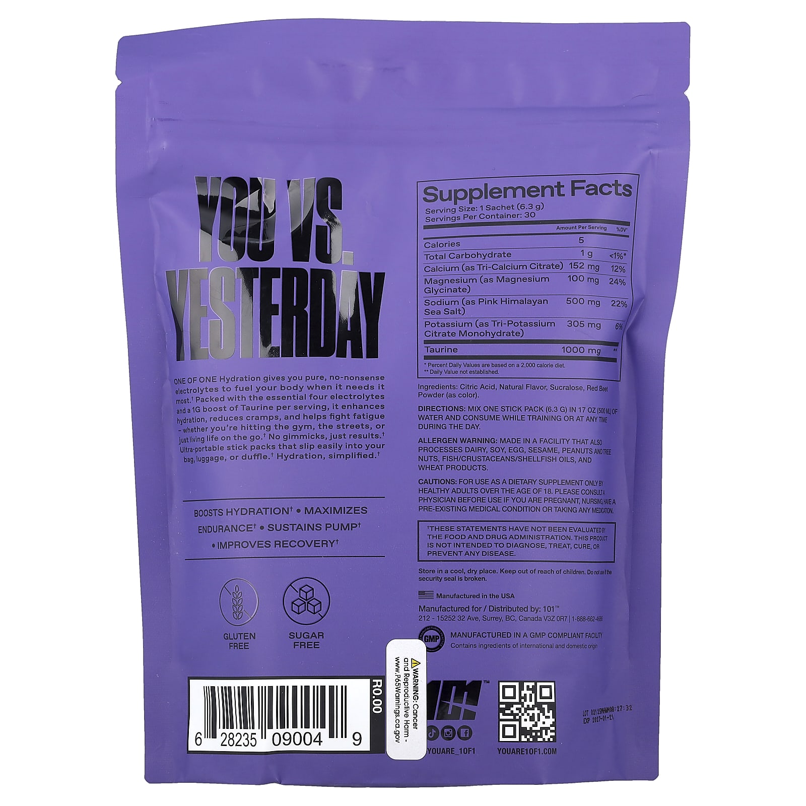 A Hidratação ONE OF ONE fornece eletrólitos puros e práticos para abastecer seu corpo quando ele mais precisa. Embalado com os quatro eletrólitos essenciais e um reforço de 1 g de Taurina por dose, ele melhora a hidratação, reduz cãibras e ajuda a combater a fadiga, esteja você na academia, nas rua ou apenas aproveitando a vida em qualquer lugar. Sem Truques, apenas resultados. Embalagens ultraportáteis que deslizam facilmente na sua bolsa, mala ou bolsa. Hidratação simplificada.