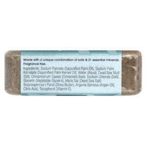 Palmato de sódio (óleo de palma saponificado), palmiste de sódio (óleo de palmiste saponificado), água (aqua), lama do mar morto (lodo), casca de Cinnamomum cassia (canela), cloreto de sódio (sal), glicerina (glicerina vegetal), maris sal (sal do mar morto), Butyrospermum parkii (manteiga de karité), argania spinosa (óleo de argão), ácido cítrico, tocoferol (vitamina E).