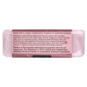 Palmate de sódio (óleo de palma saponificado), sodium palm palmiste e óleo de palmiste saponificado), água (aqua), perfume* (fragrância), sal de cloreto de sódio), glicerina (glicerina vegetal), ultramarino (pigmento mineral), sal marinho Morto), Butyrospermum parkii (manteiga de karité), Argania spinosa (óleo de argão), pó da folha de Aloe barbadensis (babosa) orgânica, ácido cítrico, tocoferol (vitamina E), extrato de Capsicum annuum (páprica) (pigmento à base de plantas).