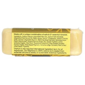 Palmate de sódio (óleo de palma saponificado), sodium palm Kersenate (óleo de palmiste saponificado), água (aqua), perfume” (fragrância), cloreto de sódio (sal), glicerina (glicerina vegetal), maris sal (sal do mar morto), Butyrospermum parkii (manteiga de karité), Argania spinosa (óleo de argão), Aloysia tryphilla (limão e verbena) orgânica, ácido cítrico, tocoferol (vitamina E), bixa orellana (urucum) em pó orgânico (pigmento à base de plantas), extrato da raiz de Curcuma longo (cúrcuma) (pigmento à base de plantas).