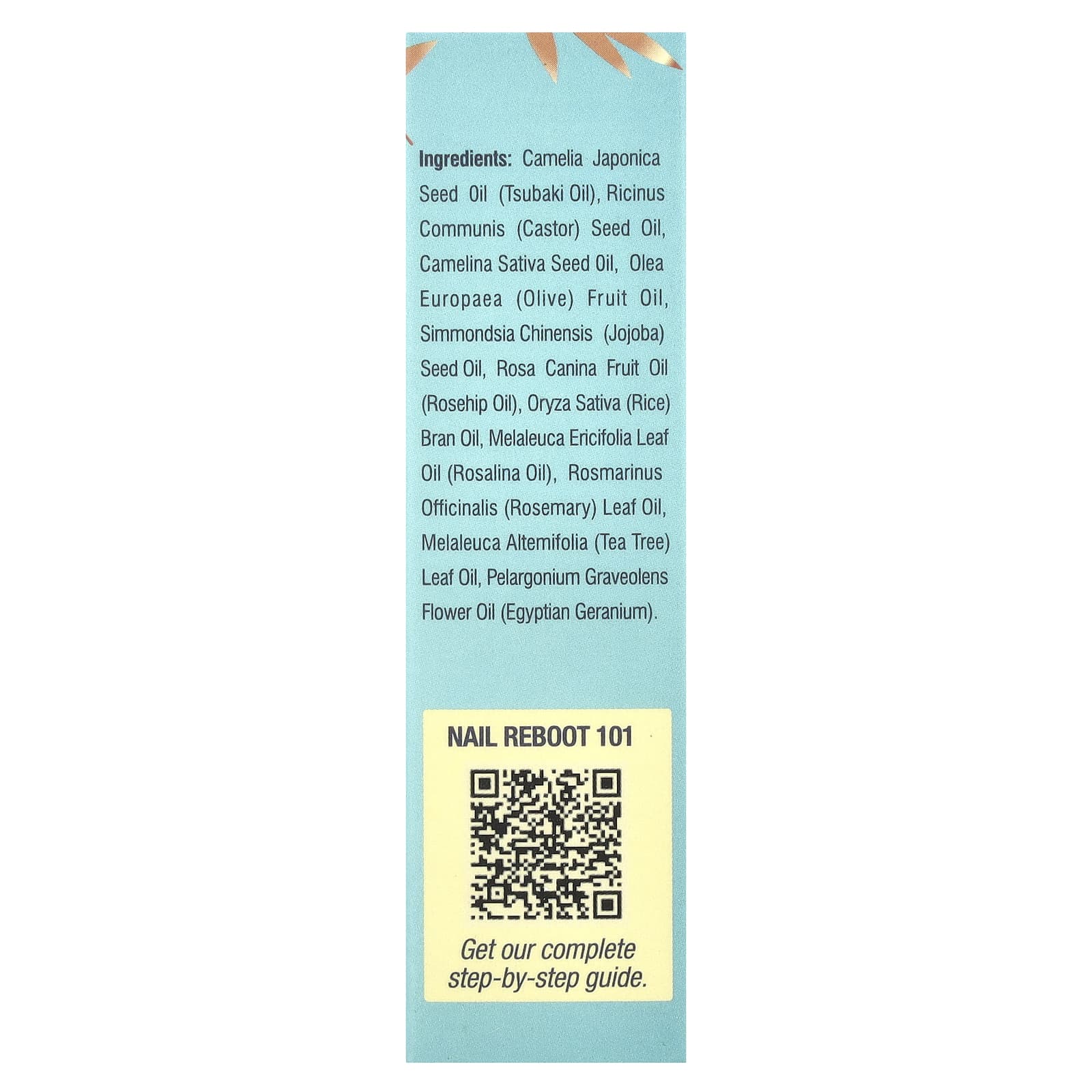 Óleo da semente de Camellia japonica (óleo de tsubaki), óleo da semente de Ricinus communis (rícino), óleo da semente de Camellia sativa, óleo da fruta de Olea europaea (azeitona), óleo da semente de Simmondsia chinensis (jojoba), óleo da fruta de Rosa canina e óleo de rosa-mosqueta), óleo do farelo de Oryza sativa (arroz), óleo da folha de Melaleuca ericifolia (óleo de Rosalina), óleo da folha de Rosmarinus officinalis (alecrim), Melaleuca altemifolia (óleo da folha de melaleuca, óleo da flor de Pelargonium graveolens (gerânio egípcio).