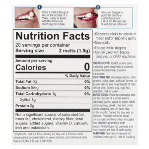 O que são XyliMelts? XyliMelts são discos de aderência oral que grudam nos dentes ou nas gengivas para aliviar a boca seca persistente. Use XyliMelts durante o dia ou enquanto dorme e encontre um alívio temporário para a sede frequente, a secura pegajosa na boca e na garganta e outros sintomas desagradáveis de boca seca. Feito com xilitol, um adoçante natural que ajuda a estimular o fluxo de saliva, o XyliMelts utiliza a tecnologia de disco aderente para liberar lentamente 550 mg de xilitol, que é mais eficaz quando liberado continuamente e permanece na boca, especialmente quando usado durante o sono, quando o fluxo de saliva está mais baixo. XyliMelts duram horas, hidratando e revestindo a boca para conforto ideal. O sabor suave de menta refresca o hálito e o xilitol pode reduzir o risco de cáries.