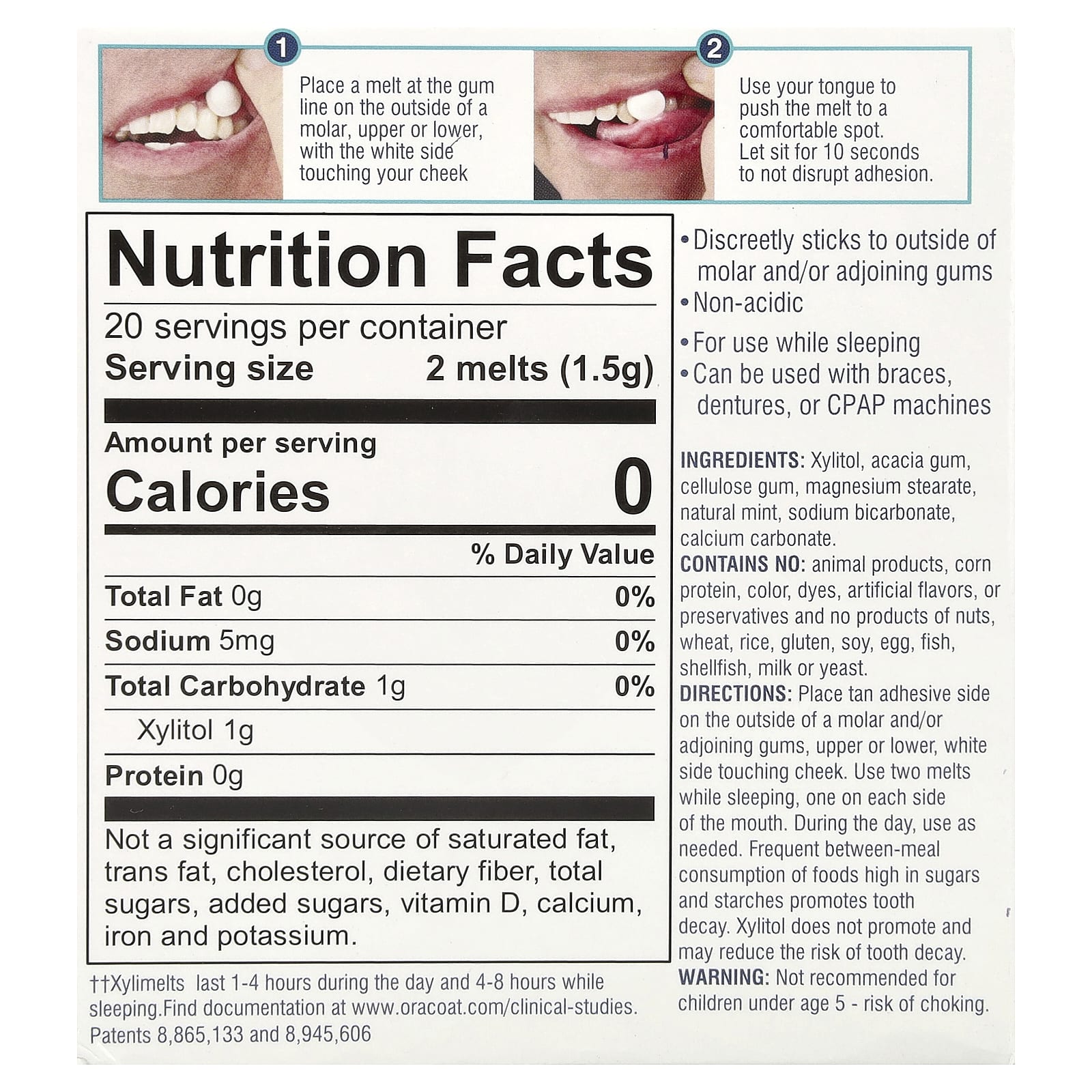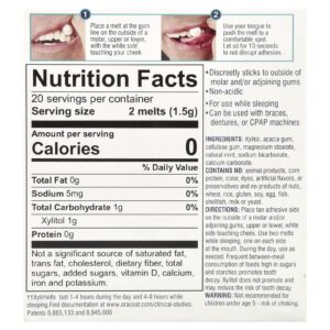 XyliMelts são discos de aderência oral que grudam nos dentes ou nas gengivas para aliviar a boca seca persistente. Use XyliMelts durante o dia ou enquanto dorme e encontre um alívio temporário para a sede frequente, a secura pegajosa na boca e na garganta e outros sintomas desagradáveis de boca seca. Feito com xilitol, um adoçante natural que ajuda a estimular o fluxo de saliva, o XyliMelts utiliza a tecnologia de disco aderente para liberar lentamente 550 mg de xilitol, que é mais eficaz quando liberado continuamente e permanece na boca, especialmente quando usado durante o sono, quando o fluxo de saliva está mais baixo. XyliMelts duram horas, hidratando e revestindo a boca para conforto ideal. O sabor suave de menta refresca o hálito e o xilitol pode reduzir o risco de cáries.