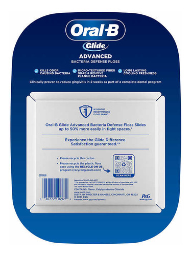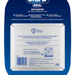 Glide Advanced Floss: Este fio dental foi projetado com tecnologia avançada para remover com eficácia a placa bacteriana e os detritos de áreas de difícil acesso entre os dentes, proporcionando uma limpeza superior em comparação com o fio dental tradicional. Fórmula de defesa bacteriana: o fio dental é infundido com uma fórmula de defesa de bactérias