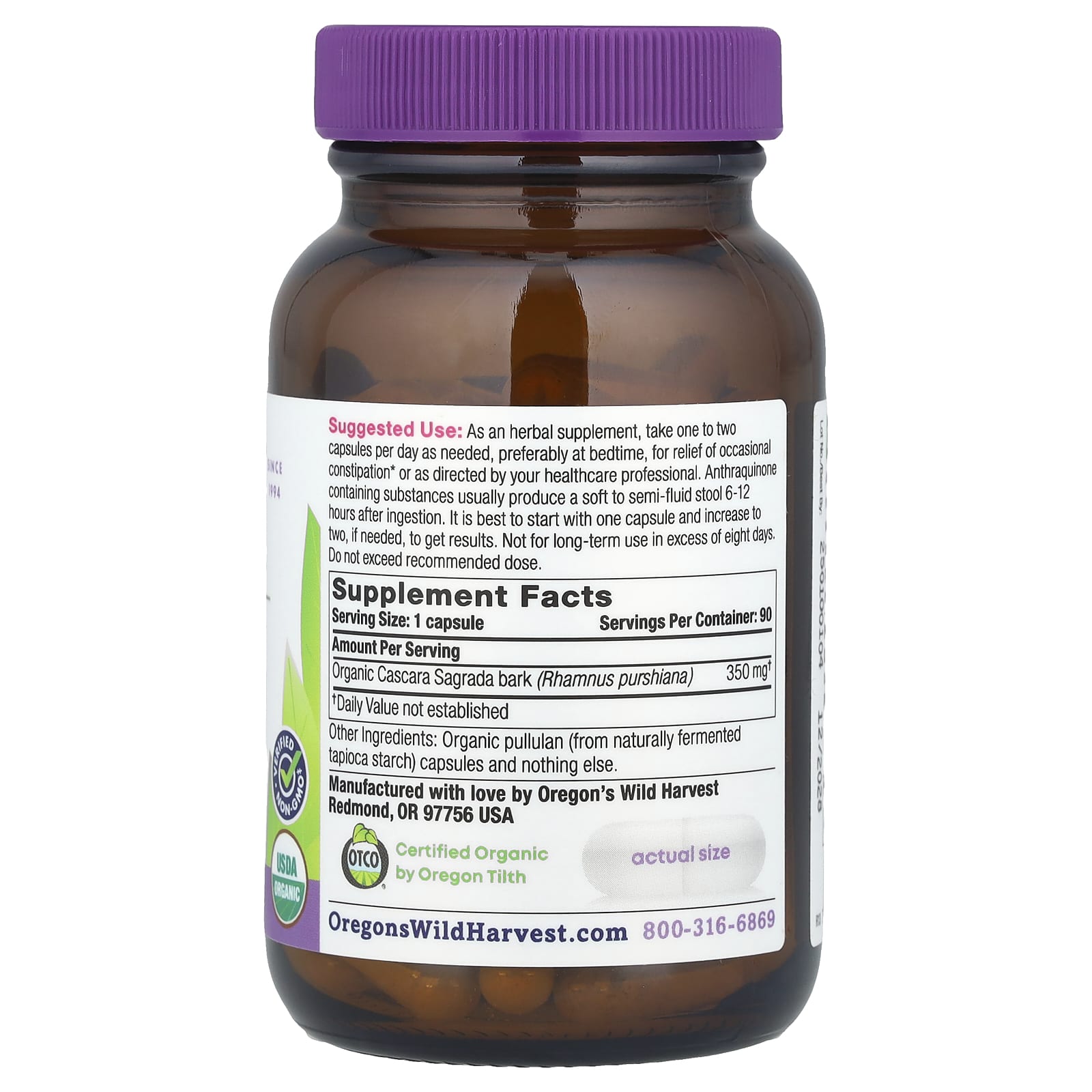 Oregons Wild Harvest Cáscara Sagrada Orgânica 90 Cápsulas Veganas Orgânicas – Oregon’s Wild Harvest Suplementos Herbs Cáscara Sagrada.