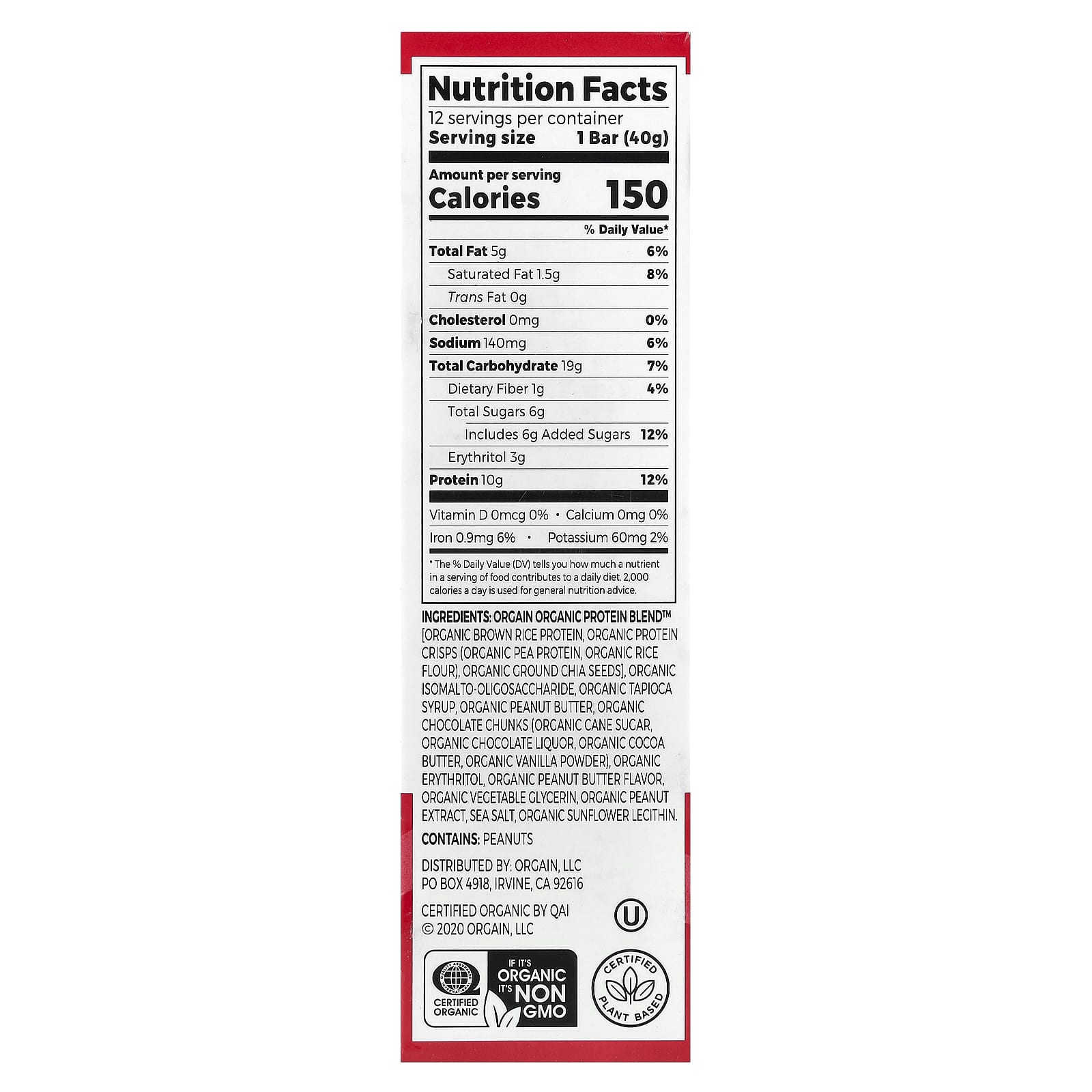 Orgain Organic Protein blend ™ [proteína de arroz integral orgânico, batatas fritas de proteína orgânica (proteína de ervilha orgânica, Farinha de arroz orgânico, Sementes de Chia Moídas Suavemente, ^Isomalto-oligossacarídeos orgânicos, xarope de tapioca orgânica, manteiga de amendoim orgânica, pedaços de chocolate orgânico (açúcar de cana orgânico, sabores de chocolate orgânico, Manteiga de Cacau Orgânico:, Sabor de baunilha orgânica, eritritol orgânico, manteiga de amendoim orgânica, glicerina vegetal orgânica, extrato de amendoim orgânico, sal marinho, lecitina de girassol orgânico