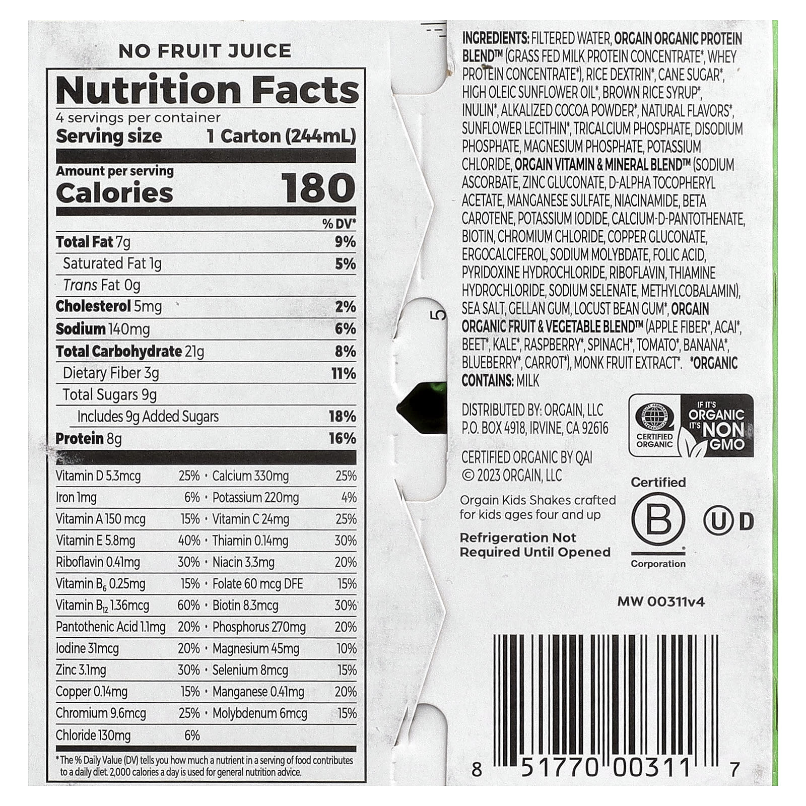 Não é necessário refrigerar até que seja aberto. Shake orgânico para crianças feito para crianças a partir dos quatro anos de idade.