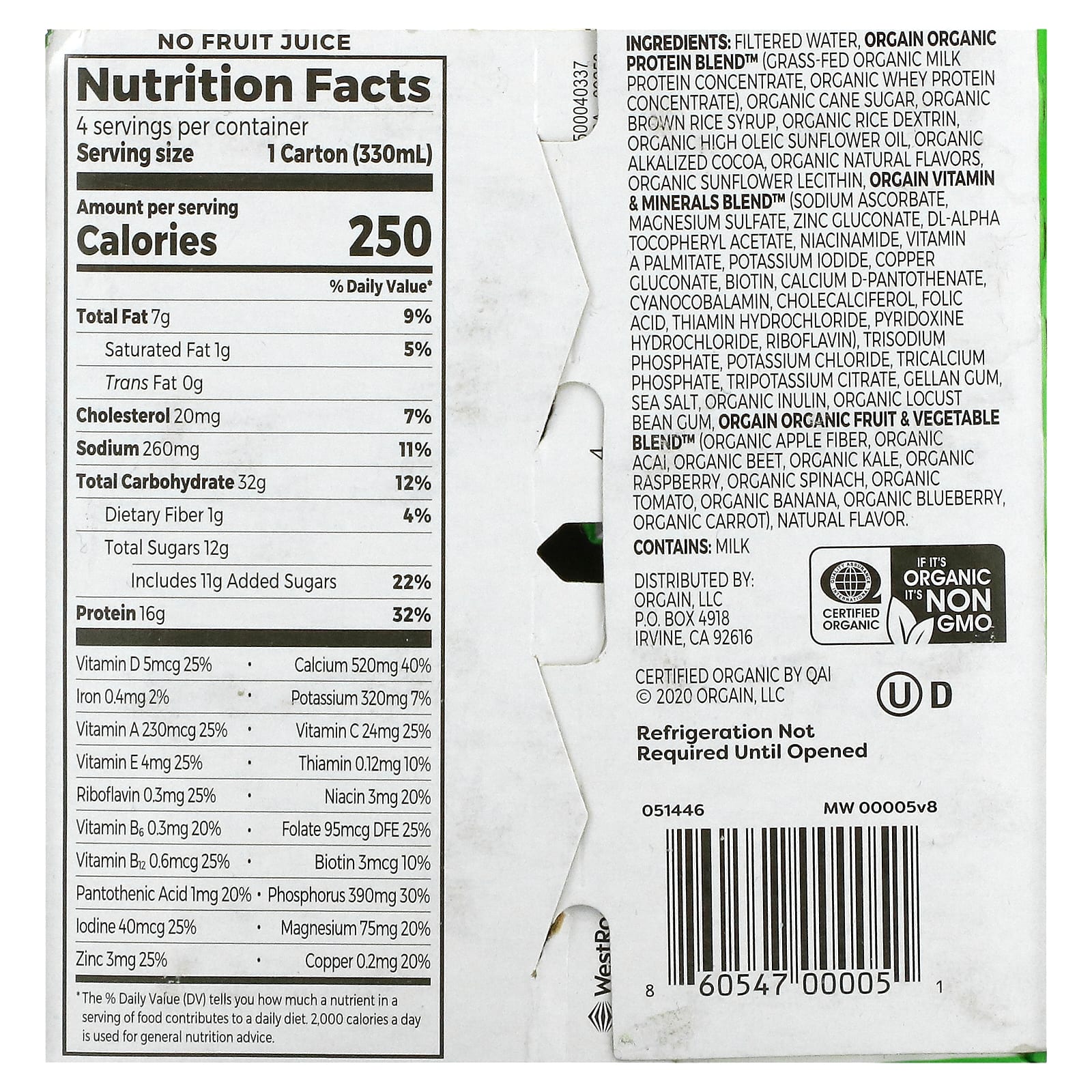 Água filtrada, orgain organic protein mix (* proteína orgânica láctea orgânica, concentrado orgânico de proteína de soro de leite), açúcar orgânico de cana, xarope orgânico de arroz integral, dextrinas orgânicas de arroz, óleo de girassol orgânico oleico orgânico, cacau orgânico alcalinizado, sabores orgânicos naturais, farelo orgânico de arroz extrair, orgain vitamina e minerais mistura (ascorbato de sódio, sulfato de magnésio, gluconato de zinco, dl alfa-tocoferol acetato, niacinamida, palmitato de vitamina A, iodeto de potássio, gluconato de cobre, biotina, d-pantotenato de cálcio, cianocobalamina, colecalciferol, ácido fólico, tiamina cloridrato, cloridrato de piridoxina, riboflavina), fosfato trissódico, cloreto de potássio, fosfato tricálcico, citrato tripotássico, goma gelana, inulina orgânica, goma de alfarroba orgânica, orgain mistura de frutas orgânicas em pó (açaí orgânico, maçã orgânica, banana orgânica, mirtilo orgânico, orgânico framboesa), orgain orgânico em pó mistura vegetariana (tomate orgânico, espinafre orgânico, beterraba orgânica, cenoura orgânica, couve orgânica), natural sabor.